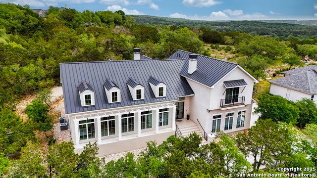 Welcome to this stunning estate home by Haven Builders, located in the highly sought-after River Crossing subdivision. Nestled on a private 1.16-acre lot surrounded by mature trees, this modern architectural masterpiece offers a perfect blend of elegance and functionality, seamlessly integrating with its natural surroundings. Step inside to discover expansive windows that frame breathtaking views, bringing the beauty of the outdoors into every room. The open-concept living, dining, and kitchen areas are accentuated by tall ceilings and the striking presence of exposed iron-strapped beams, creating a sense of grandeur. The wrought iron double-door entry and railings add a touch of sophistication, while panoramic windows and sliding doors further enhance the connection to the outdoors. The state-of-the-art kitchen is a chef's dream, featuring a Liebherr side-by-side refrigerator, a Bosch electric 5-burner cooktop with a convenient pot filler, built-in double ovens, and a sleek microwave drawer, offering both style and top-tier functionality for all your culinary needs. Additional features of this exceptional home include a climate-controlled safe room, generous walk-in attic space, spray foam insulation for energy efficiency, a Tesla charger for modern convenience, and epoxy-coated garage floors that provide durability and a polished finish. Outside, enjoy ample parking, soffit and exterior lighting, and a spacious covered patio perfect for entertaining. The home's luxurious patio features espresso tongue and groove ceilings, adding warmth and texture to the design. The outdoor kitchen is an ideal space for al fresco dining, offering a seamless transition from indoor to outdoor living. Every detail has been carefully considered to provide both style and comfort, ensuring an exceptional living experience. This is more than just a home; it's a lifestyle-where luxury meets nature in the heart of River Crossing.