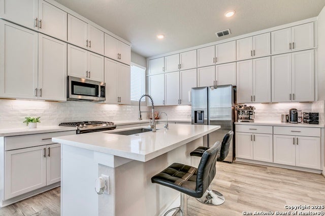 Welcome to this beautifully designed 3 bedroom, 2.5 bath home in the gated Villamanta Community. This modern floorplan features high ceilings and an abundance of windows throughout, filling the home with natural light to create a bright and welcoming atmosphere. The open concept layout flows seamlessly from the living area where a modern electric fireplace serves as a stylish focal point-to the dining area and the show stopping kitchen, designed for both cooking and entertaining. Beautiful floor-to-ceiling white cabinetry lines the space, offering exceptional storage and counter space, along with a large kitchen island, white subway tile and stainless steel appliances, including gas cooking, a single-basin sink, and a built-in microwave. The laundry room is conveniently located on the main level next to the primary suite, which features two walk-in closets, double vanity sinks, and a stunning walk-in shower with floor-to-ceiling tile. The secondary bedrooms and bathroom are located on the lower level, along with a second living area that can be used as a flex room or office. This home offers ample storage throughout and rent includes a Ring camera and stainless steel refrigerator! Located just minutes from away from Medical Center and I-10, you'll also enjoy easy access to shopping, dining, and entertainment.