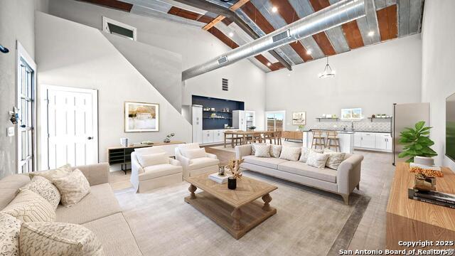 Discover the charm of the countryside with this expansive and contemporary barndominium situated on five acres within the highly desirable Lake Valley Estates subdivision and served by the equally sought out La Vernia Independent School District. This remarkable residence features one of the most substantial living spaces in the area, encompassing nearly 3,600 square feet. It offers seven bedrooms and three full bathrooms, with the versatility of two upstairs rooms that can also serve as a home office and an inviting media room. Uniquely, this property in La Vernia is equipped with its own well, a reverse osmosis water purification system, and a septic system. Upon entering through the custom iron front door, you are welcomed by soaring 22-foot ceilings in the great room. The open floor plan provides an abundance of space for entertaining, making it ideal for large gatherings, and includes a coffee bar with generous cabinet storage. The kitchen features custom cabinetry complemented by butcher block countertops throughout. The spacious primary bedroom boasts a custom ceiling with recessed lighting and adjoins via two great sliding barn doors a palatial bathroom complete with a vaulted walk-in rain shower and a separate tub, offering a serene retreat. The first floor comprises three bedrooms and two full bathrooms, while the second floor includes one full bathroom and four additional rooms, two of which can be adapted as an office and an entertainment space such as a media, pool, or playroom, offering numerous possibilities. The property also features a rear deck within a fully fenced inner backyard and a partially fenced outer border, perfect for enjoying the tranquility of the countryside and stargazing. A significant grove of oak trees on the property presents various opportunities, such as a treehouse or a picnic area. For those with a passion for gardening, a designated planting bed is available. Furthermore, the property offers ample storage space for equipment with three separate sheds, all monitored by a security camera system. This exceptional property, with its substantial lot and living area, presents a wealth of potential for its future owner. We encourage you to schedule a visit to experience it firsthand.