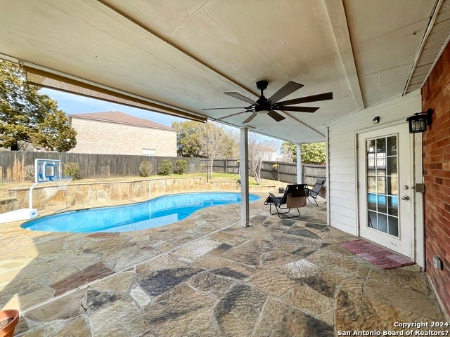 Inviting two-story residence featuring 4 bedrooms and 2.5 baths. The main living areas are enhanced with laminate wood flooring, and the spacious kitchen offers an island, abundant cabinetry, and ample counter space. The primary suite includes a private study, dual vanities, his-and-hers closets, and an oversized tiled shower. Outdoor amenities include an in-ground pool and covered patio, ideal for entertaining. Conveniently located near IH-35 and Loop 1604 with close proximity to shopping, dining, and entertainment at The Village at Forum Parkway.**Bi-Weekly pool and yard maintenance included in lease.**