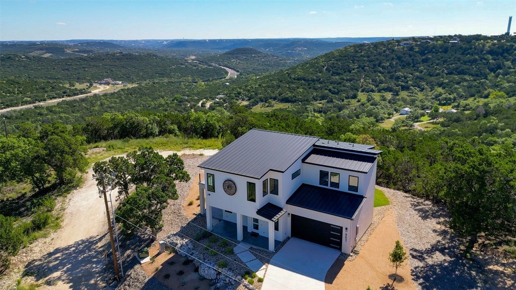 Experience your dream retreat in this new custom-built, two-story home, with breathtaking Hill Country views and sunsets. Built in 2024 with attention to quality and detail this 3-bedroom + office, 2.5-bath home features a seamless flow for indoor-outdoor living. Downstairs features on open flex space, 2- guest rooms with an expansive adjoining patio, guest bathroom, and laundry room. Head upstairs to the office that could be used as a 4th bedroom, powder room and open-concept great room with high ceilings, creating an airy, expansive feel. The chef’s kitchen includes high-end Thermador appliances, custom cabinetry, and elegant Quartz countertops—a true culinary haven. The great room includes an electric fireplace and an expansive patio overlooking the hilltops, perfect for year-round indoor-outdoor enjoyment. The primary suite provides a luxurious retreat with a walk-out patio, 2nd laundry room and en-suite bath with a soaking tub and shower. Upgrades include a metal roof, 2 x 6 framing, spray foam insulation, professional landscaping, and expansive Anderson picture windows framing stunning views. Combining elegance and ease, this exceptional property offers luxury, energy efficiency, and the natural beauty of the Hill Country—ideal for a peaceful, sophisticated lifestyle. Currently situated on a low maintenance lot, but if more land and privacy is desired, the 4 adjacent lots are available for $289k.