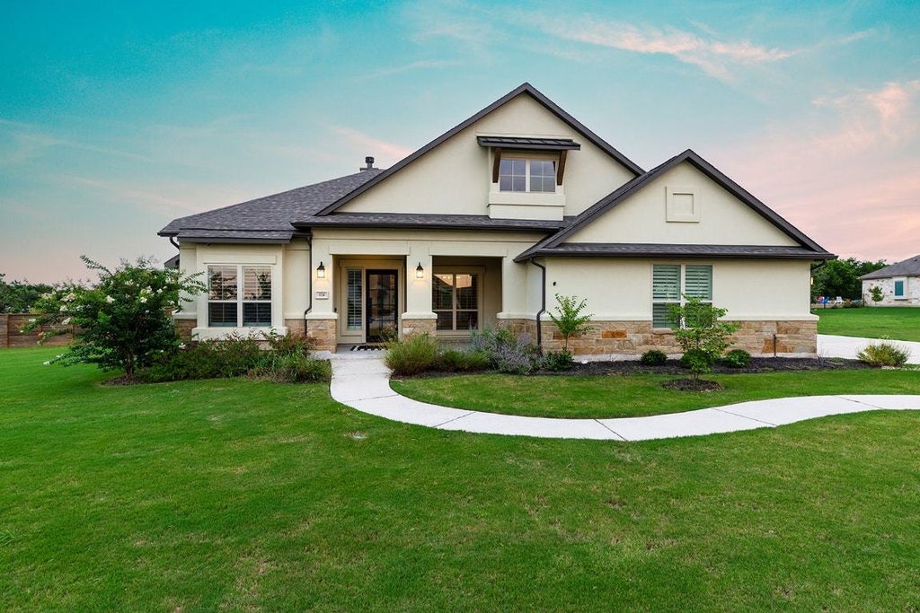 Welcome to this stunning single-story home nestled in a desirable acre lot community in Liberty Hill. This beautifully crafted residence offers 4 bedrooms and 3 bathrooms across 2,876 square feet of thoughtfully designed living space including a spacious designated study. The heart of this home features an open concept layout that seamlessly connects the living areas, perfect for both daily life and entertaining. The kitchen showcases double stacked cabinets for abundant storage, while the walk-in pantry keeps everything organized. The home is plumbed for an outdoor kitchen and sink, extending your entertaining possibilities to the backyard. You'll appreciate the stylish contemporary finishes throughout, complemented by high ceilings that create an airy, spacious atmosphere. The formal dining space offers elegant meal settings. A cozy fireplace serves as the focal point for relaxation and gatherings. The primary bedroom retreat features a luxurious free-standing tub and walk-in shower, creating a spa-like experience. The long driveway provides excellent parking options and enhances the property's curb appeal from the peaceful cul-de-sac location. This quality-built home sits on generous acreage within a well-established community, offering both privacy and convenience. The location provides easy access to Liberty Hill High School and Liberty Hill City Park, making it ideal for families seeking top-tier educational opportunities and recreational amenities. With its combination of modern amenities, spacious layout, and prime location in Liberty Hill's growing community, this property represents an exceptional opportunity for discerning buyers seeking both comfort and investment potential