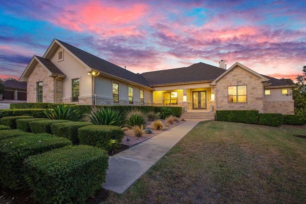 Tucked along a quiet cul-de-sac in the highly desirable Westminster Glen Estates, this stunning single-story home combines Hill Country serenity with refined modern living. All this just minutes from Four Points, Lake Austin, and top-rated schools in Leander ISD (River Place Elementary, Four Points Middle, and Vandegrift High). Inside, an inviting open floor plan showcases 10-foot ceilings, 8-foot doors, and abundant natural light. A 16-foot sliding glass wall, added during the home’s 2018 renovation, seamlessly connects indoor and outdoor living spaces. The gourmet kitchen is a chef’s dream, featuring a Kitchenaid 8-burner commercial cooktop, dual full-size dishwashers, warming drawer, prep sink, and a generous walk-in pantry. The layout flows easily into spacious living and dining areas designed for both family gatherings and relaxed everyday living. With five bedrooms, each offering a walk-in closet, plus a dedicated office and a media room with ceiling-mounted projector, there’s space for everyone to work, play, and unwind. The primary suite features an expansive custom closet and tranquil views of the surrounding oaks. One bedroom, currently being used as a second office, includes custom built-ins for maximum flexibility. The utility room includes laundry, a wine fridge, second full-size refrigerator, built-in hampers, and abundant storage and counter space. The home has gigabit Ethernet wiring throughout for music, ideal for remote work, media streaming, and smart home convenience. The spacious 3-car garage includes a Tesla EV charger. Home also has a new fiberglass shingle roof (2025) with transferable warranty. Step outside to enjoy the two covered patios, an outdoor kitchen with granite countertops, built-in gas grill, Komado Joe smoker, stainless storage cabinets, movable garden sink, and wood-burning fire pit—all surrounded by professionally landscaped grounds, soft landscape lighting and a heated salt-water pool and spa.