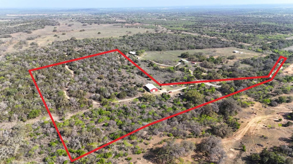 BEAUTIFUL VIEWS— PLUS a 2,800 sq ft barndo! HILL COUNTRY GEM! lThis stunning 20+ acre property with a charming barndo offers panoramic views from the top of the hill, giving you a front-row seat to some of the most breathtaking Texas SUNSETS. Builtin2015, the barndo features 2 bedrooms and 2 bathrooms, with a cozy yet open living room and kitchen space. As a bonus, there’s alarge 35 X 40 attached storage area with a loft and two 12-foot roll-up doors—perfect for storing equipment, vehicles, or transforming into your dream workshop. AND...Bring your building plans—because the top of the hill is calling. It’s the perfect hilltop homesite to take in those stunning views. If you decide to build, the barndo will serve as the perfect place to stay and can later serve as a guest house for visiting family and friends. Imagine creating your own Hill Country oasis with space to entertain, relax, and enjoy the peaceful beautyaround you. Call today for your tour!