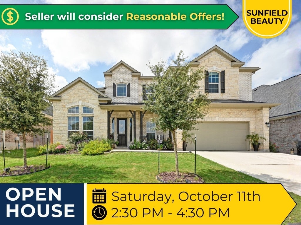 Indulge in the pinnacle of luxury living in this architecturally stunning, modern estate featuring 5 spacious bedrooms, 3.5 designer bathrooms, impeccable craftsmanship throughout. Set behind beautifully manicured landscaping & wrapped in 4-sides brick masonry, this home makes a commanding first impression—with 3 elegant porches, custom stone & paver accents, & a grand entry that leads into a dramatic, high-ceilinged interior. Step into a light-filled living space anchored by a stately fireplace & crowned with an interior balcony & soaring ceilings. The gourmet kitchen is a true centerpiece, offering gleaming granite countertops, striking white cabinetry w/ matte black hardware, statement pendant lights, under-cabinet lighting, & a marble tile backsplash—designed to impress. Retreat to the gorgeous primary suite where double tray ceilings & expansive windows create a serene ambiance. The spa-worthy en suite bath boasts a jetted garden tub, rainfall shower, marble tile, & thoughtful built-in shelving. A plush media room with double doors & full surround-sound wiring awaits your private screenings, while the formal dining room dazzles with its own tray ceiling & crown molding. Additional luxuries include an executive office with a massive walk-in closet, Jack & Jill bath, attic storage, extended covered patio & high-end finishes throughout. Perched in the vibrant Sunfield community, residents enjoy unparalleled resort-style amenities, including an elementary school, walking trails, fishing ponds, on-site lifestyle activities coordinator, open-air pavilions, a splash park, a junior-size Olympic swimming pool, & two lazy rivers. Sunfield’s prime location offers unbeatable convenience too! Just 3 minutes to IH-35, 5 minutes to the 130 toll road, & mere moments from premier shopping, dining, & everyday essentials. This is not just a home—it’s a statement of elegance, sophistication, & modern luxury. Schedule your private tour today & experience the lifestyle you deserve!