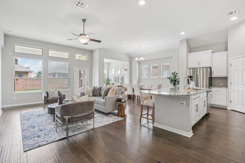 This home was made for those who want more than ordinary—it’s a place where every detail feels intentional and inviting. From the moment you see the stone-accented brick exterior, you’ll know this home stands apart. Step inside, and wood floors guide you through an open, flowing layout designed for both comfort and connection. Just off the dining area, the flexible room is ready to become whatever you need—a quiet study, music room, or personal retreat. The kitchen is the heart of the home, blending style and function with shaker-style cabinets, granite countertops, a gas cooktop, and a built-in oven. The oversized island with a breakfast bar is the perfect spot to cook, gather, and share moments with the people who matter most. When the day winds down, your primary suite awaits. A bay window fills the room with soft light, while the ensuite bath offers dual sinks, a soaking tub, a separate shower, and a spacious walk-in closet. Outside, the covered patio overlooks a peaceful backyard—ideal for quiet mornings or lively get-togethers. Living in Palmera Ridge means more than just owning a home—it’s embracing a lifestyle. Enjoy neighborhood trails, parks, pools, and a welcoming community designed for everyday living at its best. This isn’t just a house; it’s where memories are made, stories are shared, and life feels just right.