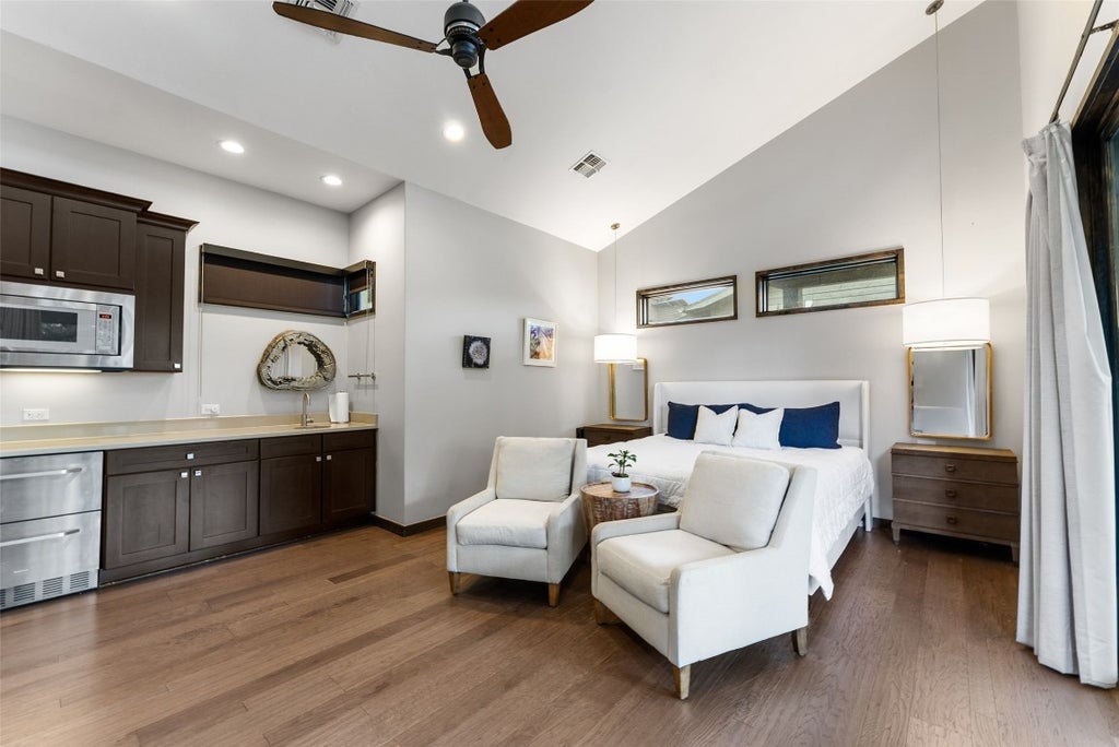 Welcome to 2113 Barbaro Way Unit 17, a beautifully appointed 1-bedroom, 1-bath villa located in the heart of The Reserve at Lake Travis, one of the area's most exclusive, gated lakefront communities. This thoughtfully designed unit offers a turn-key, low-maintenance retreat with access to world-class amenities—perfect as a weekend getaway, short-term rental investment, or cozy full-time residence. Inside, you'll find a bright and open floor plan that maximizes space and comfort. The living and sleeping areas are seamlessly integrated, featuring high ceilings, rich wood flooring, and stylish finishes throughout. The kitchenette is equipped with quartz countertops, built-in microwave, mini fridge, and custom cabinetry—ideal for light cooking and entertaining. The full bathroom is sleek and modern, offering a spacious walk-in shower and elegant tilework. Whether you're enjoying a quiet night in or preparing for a day on the lake, this villa offers comfort and functionality in a compact, luxurious setting. Step outside to your private covered patio, perfect for morning coffee or evening relaxation. Just a short walk or golf cart ride away are resort-style amenities including a clubhouse, pickleball court, and a marina with direct access to Lake Travis—even during low water levels. With lock-and-leave convenience, optional short-term rental income, and access to all The Reserve has to offer, Unit 17 is a rare opportunity to own in one of the most desirable communities on Lake Travis. Experience effortless lake living and unmatched amenities at 2113 Barbaro Way Unit 17. Schedule your private showing today!