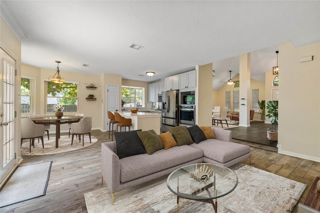 Beautifully updated home on a corner lot in the desirable Block House Creek neighborhood, with top-rated Leander ISD schools and lots of amenities. The extra-large flex room upstairs could easily be a 4th bedroom, study, or game room and is the only carpeted area in the house. Two living areas and two dining areas downstairs. The many recent updates include a spacious kitchen with plenty of cabinet space, quartz countertops, gas cooktop, a built-in oven and stainless steel appliances. The primary bedroom and bathroom feature a large bay window, beautiful dual vanity with quartz counters, freestanding soaking tub, large walk-in tiled shower, and updated light fixtures and hardware. High ceilings and lots of natural light throughout the home, along with luxury vinyl plank and tile. Upstairs AC replaced in 2022, water heater replaced in 2023, and the roof was replaced in September 2023. Block House Creek provides lots of amenities including 2 pools, tennis courts, basketball court, sand volleyball, trails, multiple parks and playgrounds, disc golf, and pavilions. Only a 5 minute drive to HEB Center, and easy access to major highways and toll roads. Just a few minutes away from many shopping, entertainment, and dining options!