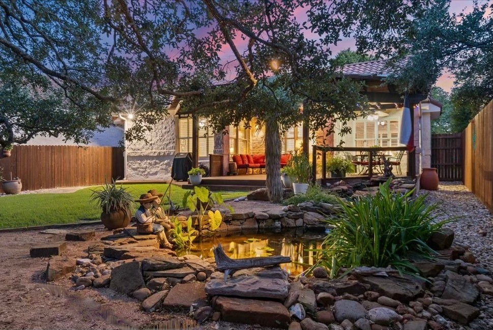 Ready to make your life easier with a lock-n-leave garden-home lifestyle? You'll love living in a gated community with less home to maintain and the front yard done for you! Rare opportunity to own this former model home, one of the most exquisite single-story residences Park West at Circle C Ranch. This picturesque Spanish-Style home includes the most beautiful backyard oasis complete with a spacious covered patio overlooking a trickling pond with happy koi fish and lush landscaping all backing to the peaceful greenbelt. Tons of money invested throughout the home including the kitchen with high-end JennAir appliances, quartz countertops, a farmhouse sink, new cabinets, elegant lighting, & pocket pantry door. Plenty of room to entertain your guests at your Banquette style dining space with custom-fit bench seating and storage underneath maximizing this space with an architectural appeal while creating a cozy atmosphere. Additional updates to the bathrooms and added custom built-ins and lighting in both bedrooms. Guest room is equipped with a built-in Murphy bed that easily transforms this space from a home office to a guest suite. Only exquisite wood and tile floors throughout the home (no carpet!) The home is wired for alarm system and camera at front door. The garage is compete with epoxy floors, electric car charger, and tons of cabinetry for storage! Walking distance to the Circle C Swim Center where you can enjoy lap swimming, The Dive Cafe, & sport courts. Take a stroll or bike ride to one of the nearby trendy restaurants including District Kitchen & Bar, Satellite Cafe, Torchy's, Waterloo, TCBY, Taco Deli, Keepers Seafood and Alamo Drafthouse movie theatre. 2 minutes to Mopac for a 10 minute commute to downtown! HOA dues are $140/ month to Park West HOA that maintains the front yard and $481 semi-annually to Circle C Ranch for access to 4 pools, parks, playgrounds, trails, sport courts, etc.