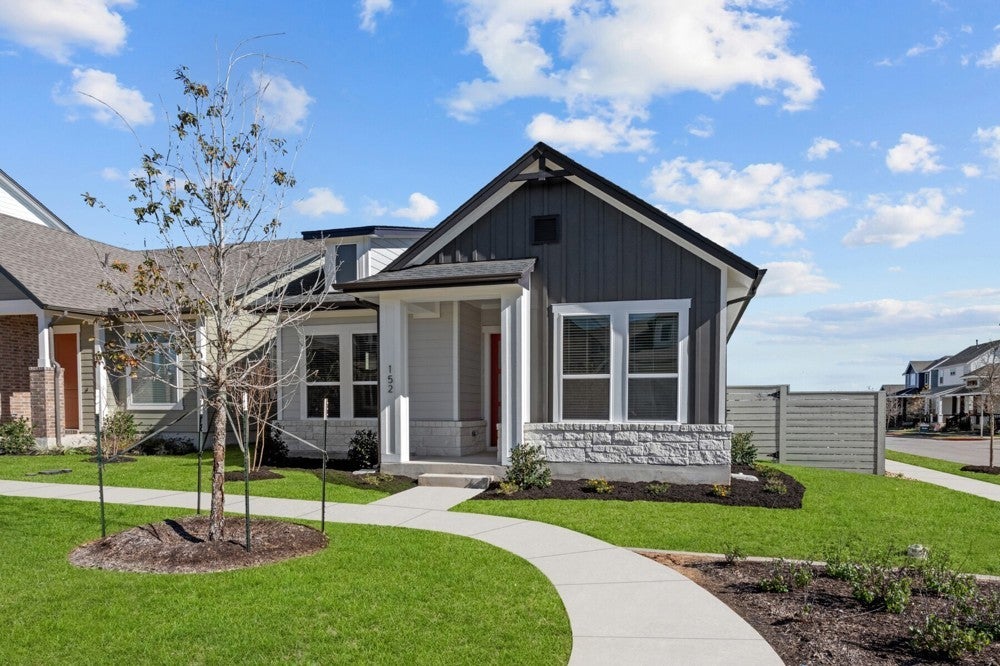 LIMITED TIME buyer incentives for closing costs + interest rate buy down! One of the last fully upgraded David Weekley Homes in Adelton — move-in ready with premium design selections & meticulous attention to detail. Private self-guided tour option available - details posted at the home. Gourmet Chef's kitchen: extended ceiling-height cabinetry, under-cabinet lighting, 36 inch cooktop, double oven, and GE appliances Designer finishes: upgraded fireplace & media wall, accent lighting, Luxe Italian-inspired tile & stoneware in bathrooms, 8-foot doors, ceiling fans in every room, and designer-selected hardware unify the home in a refined aesthetic. Flexible layout: 2 bedrooms + private study with custom bookshelves (or optional 3rd bedroom) Low-maintenance lot with HOA-maintained courtyard out the front door Community features: 50+ acres of parks and trails, 3,000+ trees, future amenity center with pool, pavilion, beer-garden patio, playground, and sports courts Prime location: minutes to downtown Bastrop, easy access to Austin, Tesla, and SpaceX A rare opportunity to own a high-end, move-in-ready David Weekley home in one of Bastrop’s most sought-after communities.