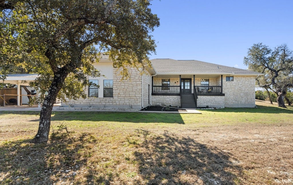 This beautifully updated home is located in the highly sought-after Sunset Canyon North, offering a serene 2-acre, fully fenced lot with towering oak trees and expansive lawns, capturing the essence of the Texas Hill Country. The charming single-story residence showcases an open-concept design. The spacious living area boasts vaulted ceilings, a wood-burning fireplace, wood floors, and stunning views of the private backyard. The home offers a fantastic layout, including a front study, formal dining/sitting area, and a country-style kitchen with a breakfast room that opens to the living room. The owner's suite is a true retreat with a sitting area, an updated bath featuring double vanities, and a luxurious spa shower with multiple shower heads. Additional highlights include a large utility room, a game/media room with a pull-down screen and projector setup, and a bonus room ideal for crafts or exercise.