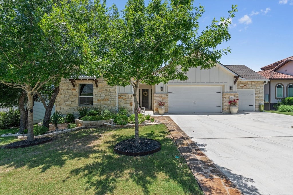 Looking for the Kissing Tree active lifestyle, but want to go home to privacy and a park-like setting? Then, this home is for you! This golf course home has picturesque views of the 9th fairway, lovely groves of shade trees & sparkling water views of the greenside pond. The outdoor patios have unobstructed views of the fairway. Custom landscaping, stone work, flagstone patio, cov'd patio w/Bull grill, & mororized solar shades plus an inner courtyard for intimate dining & lounging with lots of windows that brings the outdoors inside. Magical sunsets, no houses in sight & unobstructed views of the lush fairway. A seamless front-facing golf cart garage was added to this extra large lot. This thoughtfully designed home offers an open-concept floorplan with lots of natural light, wood & tile floors, custom light fixtures and plantation shutters. Custom Michael Edwards soft-close cabinetry w/designer pulls provide abundant storage for the kitchen, dining room, den & laundry. Plenty of workspace in the kitchen w/an oversized granite breakfast bar with pendant lighting & custom coffee bar w/leathered granite. Custom built-in cabinetry in the family room includes a Sonos sound system & flat screen tv. Study has custom cabinetry, desks & combination file drawer system. Spa-like bathroom with a spacious walk-in shower, Inspired closet systems, motorized patio door shades plus motorized patio solar shades. A new roof & full gutters were added 2 years ago. Kissing Tree's unparalleled amenities include an 18-hole golf course, an indoor & outdoor pool, 18 pickleball courts, a gym, restaurant, miles of walking trails, & the Mix activities complex. With numerous monthly activities, there's always something exciting to do! Carved in the foothills of the Texas Hill Country, Kissing Tree is perfectly positioned between Austin & San Antonio, offering a vibrant, active lifestyle with breathtaking natural surroundings. This home is a show-stopper with unparalled seller & builder upgrades.