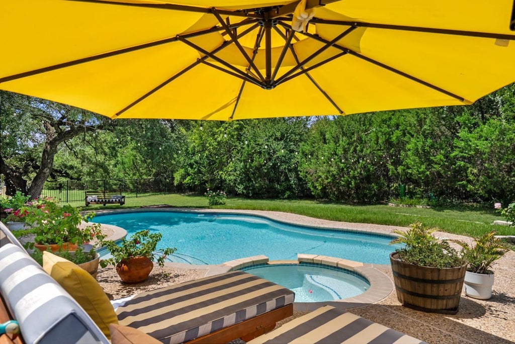 Discover the private oasis for your best life in this charming 1.2-acre cul-de-sac estate. Tucked away in the desirable gated Gabriels Overlook neighborhood this property offers unparalleled privacy and a serene escape. Enjoy stunning sunsets surrounded by nature, as the property backs up to a lush green space with fishing pond, and an abundance of local wildlife. A private gate from your backyard leads you directly to the extensive walking trails that wind through the natural landscape. This home is a haven for those who appreciate the finer things & relaxed pace of life. A standout feature is the established personal vineyard, ready for you to enjoy your winemaking hobby. Mature Tempranillo, Sangiovese, and Mourvedre grape vines—all sustained by a dedicated irrigation system. Inside, the inviting kitchen is a chef's delight, featuring a center island, beautiful quartz counters, and a decorative Bourge Arco ceramic tile backsplash. The upgraded cabinets include accent rain glass doors, complemented by pendant lights, stone on the breakfast bar, and high-end stainless appliances. Throughout the home, you'll find elegant details like tray ceilings and all hard-surface flooring, including both hardwood and tile. A practical Murphy bed in a secondary bedroom offers flexible space for guests or hobbies, while the oversized utility room includes a convenient sink. The serene owner's retreat is a peaceful sanctuary with a tray ceiling and a spacious en-suite bath complete with a jetted tub, separate shower, dual sinks, and a large walk-in closet. Step outside to your private outdoor paradise with a heated pool and spa. Relax in a tranquil pergola, where a daybed is nestled beneath a canopy of fragrant roses and lush grapevines. For health enthusiasts, an Infrared Sauna and massage therapy spa are both negotiable. The detached workshop is a versatile space for any passion, featuring, electricity, and an AC unit. This is a one-of-a-kind home you won't want to miss.