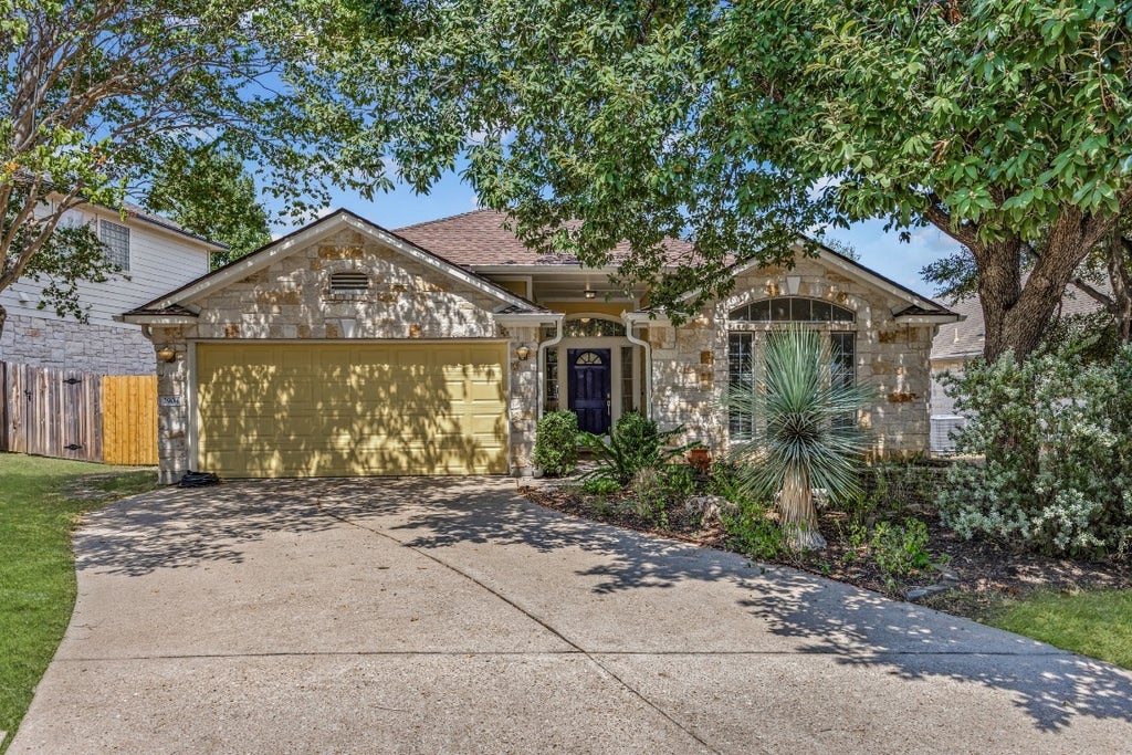 Interest rates are lower right now. Ask Seller for closing costs to lower rate some more. Rare single story stone gem in South Austin’s beautiful Bauerle Ranch, within a 300 acre preserve enjoyed by all ages from tiny tots to elders. Walking trails, pool, playground, basketball court a short walk away. High ceiling living room with corner fireplace, dramatic arched window, large command kitchen opens to garden views, the living room, 3 dining spaces including a two-sided breakfast bar, convenient walk-in pantry/laundry, fun chalk board wall, gas cooking, Bosch dishwasher, pretty shelves will stay. Soaring ceiling in spacious primary bedroom retreat with high arched window, walk-in closet, bath with separate shower, relaxing soaking tub, dual sinks, glass block window. 4th bedroom or study, studio or craft room as 2nd living has French doors. Two more bedrooms and a bath are located away to provide privacy for the Owner's suite. Wood and tile floors, no carpet. Impressive front door with a covered entry with a high arched transom window and side light windows with an lighted art niche in the entryway. Many ceiling fans, level driveway with 2 car garage with door opener, recent roof, water heater, fence, paint, and stainless refrigerator. Enjoyable backyard natural beauty, a carefully chosen collection of native plants, fruit trees, curved stone planters and paths, metal arched arbor, covered porch with a fan and sun shade. The garden is a serene setting for peaceful relaxing and sharing the wonders of the natural environment and enjoying different seasons of good veggies, fruit and flowers. The active HOA hosts frequent community gatherings for music, food and fun for neighbors to gather and play together and all for a low HOA fee. Easy access to South Austin shopping, dining, and Stinson Entertainment District with popular food and drink spots. Easy access to Mopac, and I-35. A wonderful place to live peacefully with nature right in the middle of vibrant Austin.