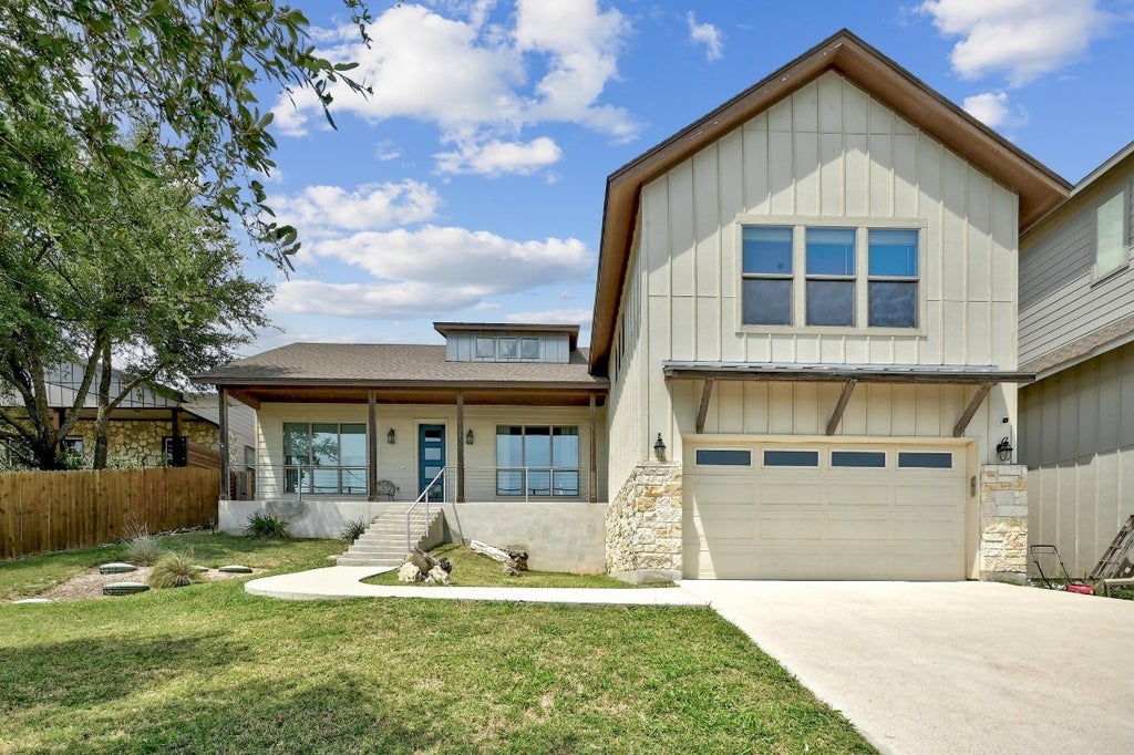 HOME WARRANTY. This contemporary custom home offers show-stopping curb appeal and the feel of brand-new construction. Designed with style and functionality in mind, the home features rich Acacia hardwood floors, custom cabinetry with a farmhouse sink, stainless steel appliances, a pot-filler, and sleek Carrera marble countertops—every detail thoughtfully selected to impress. The open-concept layout boasts soaring cathedral ceilings and an abundance of windows that frame sweeping Hill Country views while flooding the interior with natural light. The gourmet kitchen centers around a large island with a breakfast bar, making it ideal for both everyday living and entertaining. The spacious primary suite is a private retreat complete with a custom walk-in shower, generous walk-in closet, and serene finishes. A large flex room off the main living area can serve as a game room, media space, or home office—tailored to your lifestyle. Enjoy outdoor living with a private, fenced backyard featuring a covered patio, as well as a welcoming front porch perfect for savoring the view. Located in a sought-after community with access to parks, lakes, and recreational amenities, and zoned to the highly acclaimed Lake Travis ISD, this home truly has it all. Schedule a showing of your new home today!