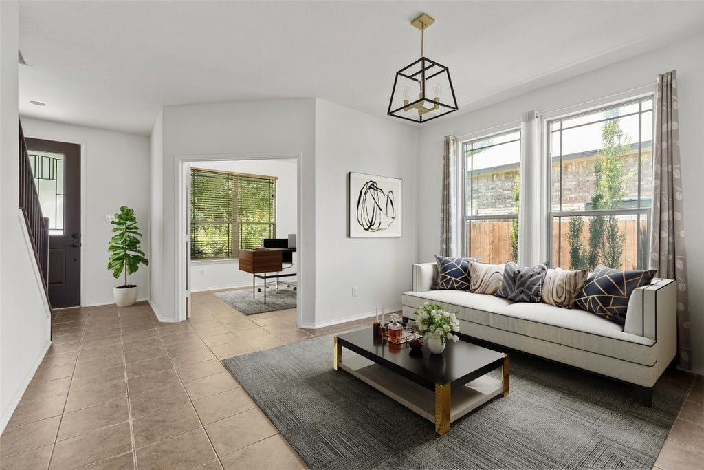 **Carpets will be replaced with brand-new ones soon, offering a lighter and more elegant color—an attractive upgrade for the home.** Some homes just feel like the start of something good—this is one of them. Set on a serene street in La Conterra, this two-story gem in Georgetown blends charm, function, and Texas warmth in all the right places. The curb appeal? Instantly magnetic, with clean-cut landscaping, soft brick tones, and wood-accent shutters that give a modern farmhouse nod without being overdone. A wide driveway and double garage offer space without compromise, and behind that handsome front door lies something special. Step inside and you'll feel the openness invite you forward. Natural light filters through oversized windows and bounces off crisp white walls and warm ceramic tile. The front office or flex room makes working from home feel like an upgrade—not a compromise. There’s room for productivity and pause, thanks to garden views and an easy energy. Flow into the heart of the home, where an open-concept living space blends lounging, dining, and cooking seamlessly. The kitchen is loaded with warm wood cabinetry, sleek granite-looking counters, and an extended breakfast bar that’s built for pancakes, late-night chats, or game day snacks. The living room pulls everything together with comfy sectional seating and views into the backyard—yes, it's ready for your next BBQ. Upstairs, the primary suite stretches out with a bonus sitting area that feels like your own private lounge. Large windows bring in soft morning light and the layout invites calm. Two additional bedrooms are just the right size for kids, guests, or hobbies, and the full-size upstairs bath keeps things flowing. If you're ready for a home that lets you breathe, grow, and settle into Georgetown's easy rhythm—this one's calling your name.