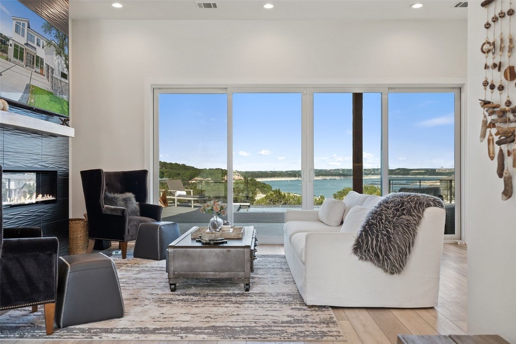 Experience the Ultimate in Lakeside Luxury Living at Waterford on Lake Travis. This stunning custom-built estate, nestled within the highly sought-after, gated community of Waterford, offers a resort-style lifestyle with breathtaking views of Lake Travis. Boasting a fully furnished interior, this stunning home sits on an expansive 1.146-acre lot andfeatures a n entertainer’s deck, faux infinity pool, great lawn, and a second-floor balcony, all overlooking the majestic Lake Travis. The sleek and modern interior design seamlessly blends natural elements with bright, open spaces and state-of-the-art finishes. The luminous open floor plan encompasses the living room, gourmet chef’s kitchen, and formal dining area, all adorned with high ceilings, LVP flooring, walls of windows and custom sliders, ensuring that every room captures the stunning lake views. The chef’s kitchen is a culinary masterpiece, featuring an oversized center island, quartz waterfall countertops, breakfast bar, custom cabinets, and top-of-the-line appliances. The luxurious primary retreat, situated on the main floor, offers direct access to the back deck, ensuite bathroom, while a bonus home office provides convenience. Upstairs, a centrally located game room, a covered balcony, 3 guest bedrooms with 2 full guest bathrooms await. The outdoor oasis is an entertainer’s dream, with a covered porch,
