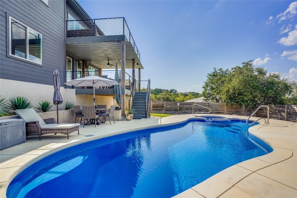 Amazing Views / Gorgeous Pool!! Upon entering the house, you will find the first of three secondary bedrooms that is being used as an office by the current owners. This room has built in Desk and cabinets with plenty of room for a Murphy bed. The Kitchen is located on the main floor, quartz countertops with a feature island and farmhouse sink, custom cabinets with soft close drawers and doors. The living and dining area are completely open and spacious. There is a custom built in located in the main living area that features a very large electric fireplace and an 85” Flatscreen that conveys with the property. In addition the main floor of the property boasts one of the three gorgeous decks, perfect for catching some of Lago Vista’s beautiful Sun Sets and great star gazing. The Main Floor Primary Suite includes an oversize double shower, a double vanity with Quartz countertops and a large walk-in closet, the primary bedroom is spacious and includes a feature wall. Once downstairs you will find an entire new living space perfect for multigenerational living. The second floor includes a secondary Master bedroom, a full bath, along with a fourth bedroom, a built in snack bar with microwave and mini refrigerator, a large living area that leads out to another large deck that is covered so that you can enjoy a rainy day while staying dry or get some shade while you grill and chill by the amazing in-ground pool and spa. Pool includes a water feature and fire pit perfect for lots of summer fun. The pool has a heater so you will be able to use it almost year round. This is one of those properties you need to come and see for yourself to fully appreciate all of the details that make it so great. A bonus feature of this home is the extra storage space that is completely finished out downstairs that is not included in the square footage. The property also boasts a three car garage and extra parking for toys and guests. Come and see this amazing place for yourself.