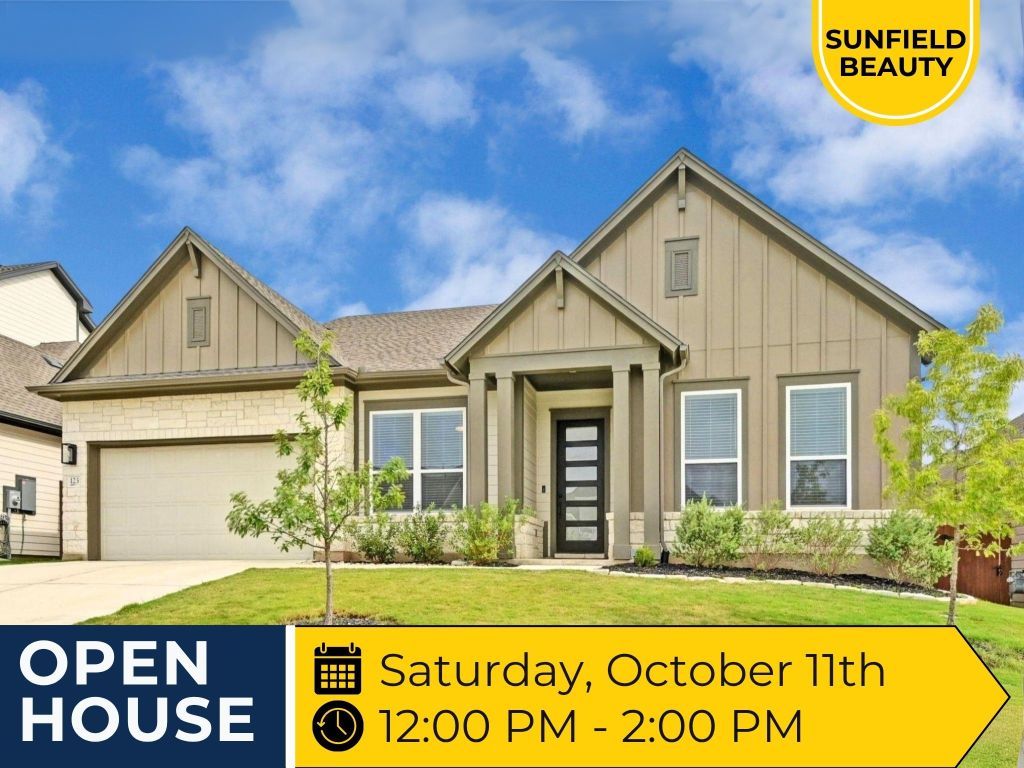 Step into elevated living with this stylish modern home by David Weekley, where every detail reflects a refined taste for design. Boasting a chic mid-century modern vibe throughout, this 3-bedroom, 2-bathroom residence offers 1,902 sq ft of thoughtfully crafted space. Rich luxury vinyl plank flooring flows under soaring ceilings, creating a sense of openness and sophistication. The kitchen is a true showpiece—featuring deep green lower cabinets paired with crisp white uppers, complemented by striking granite countertops with dramatic dark and white marbling. Gold hardware and statement round pendant lights add a touch of glamour, making it the perfect space to entertain or simply savor your morning coffee. The oversized covered patio extends your living space outdoors, offering a stylish retreat ideal for relaxing or hosting guests. While the backyard is designed for easy upkeep, its size enhances the intimacy and coziness of your private outdoor sanctuary. The refrigerator, washer, dryer, water softener, grill & lawn mower are ALL INCLUDED!!! Built for those who crave something beyond the ordinary, this home is tailored for buyers with discerning taste—individuals who appreciate quality, style, and a luxurious yet livable atmosphere. Perched in the vibrant Sunfield community, residents enjoy unparalleled resort-style amenities, including an elementary school, walking trails, fishing ponds, an on-site lifestyle activities coordinator, several open-air pavilions, a splash park, a junior-size Olympic swimming pool, and two lazy rivers. Sunfield’s prime location offers unbeatable convenience too! Just 3 minutes to IH-35, 5 minutes to the 130 toll road, and mere moments from premier shopping, dining, and everyday essentials. Upgrade your lifestyle—you’re ready for more. Make this exceptional designer home yours today!