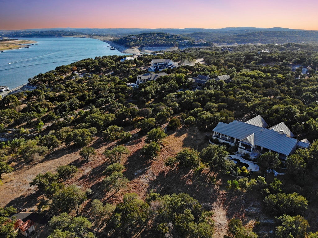 Escape to this striking one owner, single level, custom built waterfront estate located in Travis County. This well appointed home is peacefully situated on 6+ acres. Breathtaking views overlook deep water Lake Travis, as well as vistas of tranquil spaces studded with oak trees. The 15+ acre community park and marina are located next to and below this estate, offering undeveloped neighboring land for your enjoyment at this once in a lifetime restful residential resort. The Hill Country Ranch architecture has been constructed with the finest in design and materials. The covered front porch allows one to enjoy wooded landscapes and wildlife. The spacious family room is adorned with a floor to ceiling fireplace, wet bar, wood-beamed ceiling, and access outdoors. The open floor has a nearby gourmet kitchen featuring top of the line appliances, 2 islands, butler’s pantry, wine refrigerator, and more for the avid cook. There is a lovely primary suite with fireplace, verandah access, soaking tub, separate shower, and 2 walk in closets. A second primary suite and 2 additional en-suite bedrooms are located on the opposite side of the home. There is a handsome library with built in bookshelves and fireplace, and an office with built ins. Ease of indoor/outdoor living and entertaining! The rear yard includes a verandah of approx. 1,600 square feet, outdoor kitchen, sparkling pool and spa, and expansive grounds. Other features include pecan cabinetry and built ins, cherry wood millwork, Italian limestone, quartz, Saltillo tile, granite, mesquite flooring, custom tiles, triple-zoned HVAC, security system, well insulated construction, metal roof, and huge garage with storage room. The estate has access to a community water supply, private well, and access to Lake Travis water. There is a community tennis and pickleball court, a gazebo and barbecue area, and marina with 18 slips. Lake Travis ISD. A boat slip is available for separate negotiation. A must see estate!