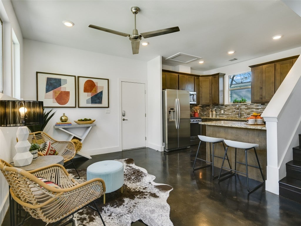 Fantastic move in ready Two Bedrooms, Two FULL baths, attached 1 car heated and cooled garage, with fenced yard! Free-standing condo with no shared walls and its own private yard provides modern comfort and functionality. As you enter the home, you'll be greeted by an open-concept living space with sleek finishes, designer touches and an abundance of natural light. The gourmet kitchen boasts gas cooking, stainless steel appliances, granite countertops, and ample cabinet space, making it a chef's dream and an excellent space for entertaining. Upstairs, relax in the primary suite with high ceilings, wood floors, and a spa-like bath featuring a double vanity and an oversized, luxurious walk in shower. Downstairs, the second bedroom and bath are perfect for a roommate, guests, home office, or a growing family. This home also includes a laundry closet on the main level with stackable washer and dryer, and plenty of storage throughout. The attached garage is air-conditioned with recessed can lighting and provides secure parking or living space. Private, fenced yard and deck offer two terrific gathering spots and outdoor living spaces. Great location close to Springdale General, Givens Park, Springdale Park, and Mueller. Red Bluff Nature Preserve has hike and bike trails with amazing panoramic views of downtown and the trail head is a block away. This is the perfect location just steps away from the bus line and restaurants surrounding the area. Come and enjoy the unique lifestyle of the East side! Also, rare for the area: Short Term Rental allowance currently underway. HOA has paperwork ready to file.