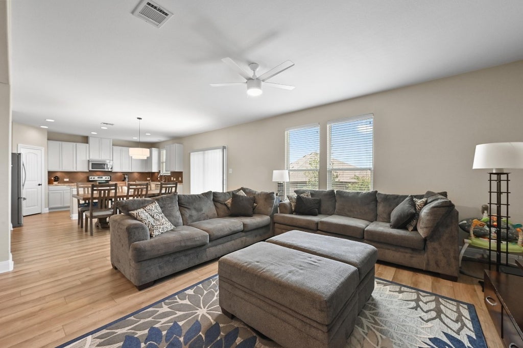 Tucked away on a spacious cul-de-sac lot in the popular Waterleaf community, this charming home offers a fantastic open-concept layout with a large family room and a versatile flex space on the main level, along with three bedrooms—including a generous primary suite with a dual vanity and walk-in closet. Upstairs, a huge fourth bedroom with its own full bath provides the perfect space for guests or could easily serve as a game room or media room. Fresh interior paint and gorgeous luxury vinyl plank flooring, installed just a year ago, create a modern, inviting feel throughout, accented by raised panel doors that add an extra touch of style. The open kitchen features a breakfast bar, stainless steel appliances, and extensive cabinetry—including extra built-ins that extend into the breakfast area, offering impressive storage space. You’ll also appreciate the oversized closets, a spacious laundry room with room for an extra fridge, and a 2-car garage equipped with overhead storage racks. Out back, a large patio makes entertaining easy, with plenty of room to relax and enjoy. This home is just blocks from fantastic community amenities like a pool, multiple playgrounds, and sports courts, and is only minutes from local parks, schools, shopping, and dining. With a quick drive into Austin, you’ll enjoy the perfect balance of suburban comfort and urban convenience. Don’t let this one get away!