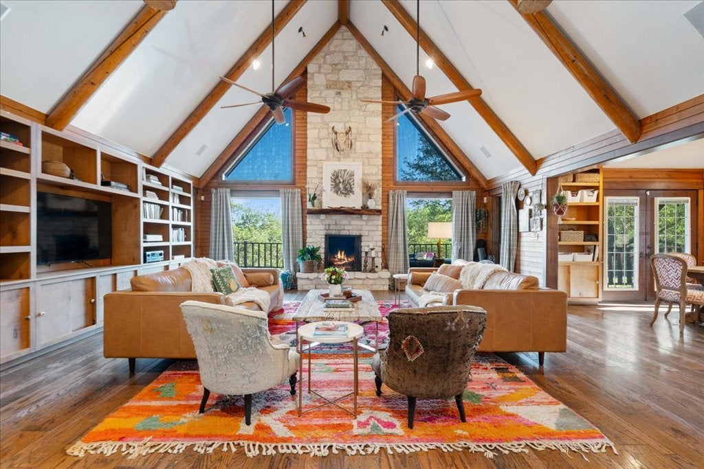 Welcome to Texas Hill Country living! No HOA, city taxes, or MUD! This 3-bedroom, 2.5-bath log home with the green metal roof sits on nearly 8 oak-filled acres with winding trails. It is completely fenced and gated for added privacy. From the wrap-around porch, step inside to find a sunlit, open-concept living room with a vaulted beamed ceiling, stone fireplace, and built-in bookshelves. The spacious kitchen flows into the dining area and out to a large deck overlooking the property, perfect for welcoming the day or enjoying the stars at night. The first-floor primary suite includes a bathroom with his-and-her closets, a clawfoot soaking tub, separate shower, and another set of French doors leading to the deck and garden views. Upstairs you'll find two spacious bedrooms at each end of an open hallway overlooking the living room, and an enclosed loft with vintage windows - the perfect office or art studio space. Back downstairs, a large laundry room with sink and extra storage makes a great mudroom after gardening or hiking through the woods. Outside, the rolling terrain makes the property feel even larger than it is, offering space to add on and still enjoy roaming the back woods. The huge barn features enormous sliding doors, a separate enclosed and air-conditioned office or studio, and lots of extra storage space. So many possibilities! Whether you want to utilize the existing animal structures and garden and start your own dream farm, or use the space to create a dream resort-style pool and cabana, this property is just waiting to be your private escape. Although it feels miles away from anything, you’re actually just 5 minutes from Lago Vista, 20 minutes from Cedar Park, and 40 minutes from downtown Austin. Access to Lake Travis is right in Jonestown.