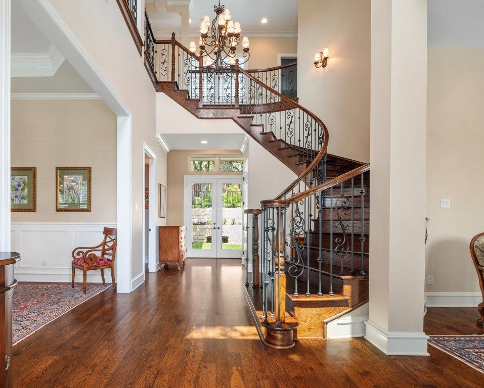 This luxurious custom home by Alkire Construction in Original Lakeway is a true gem, offering breathtaking panoramic views, exquisite craftsmanship, and an ideal location on a tranquil .4-acre cul-de-sac lot surrounded by majestic Texas Live Oaks. Thoughtfully designed for ease of living and entertaining, the home lives like a SINGLE-STORY with the nearly 75% of the square footage on the main level and zoned HVAC. Rich oak wood floors, soaring ceilings, walls of windows, and elegant custom millwork blend timeless style with modern comforts. The chef’s kitchen is both beautiful and functional, featuring custom cabinetry, a center island, gas cooktop, and double ovens. The spacious primary suite boasts his & hers bathrooms and a large walk-in closet, while a private guest suite, dual living and dining areas, a wet bar, and a butler’s pantry with walk-in dish storage complete the main level. Upstairs, find two guest rooms, a large bathroom, third living area with kitchenette perfect for family movie nights, and an upper balcony with STUNNING sunset views. Enjoy the expansive covered outdoor living area with a summer kitchen and serene treetop backdrop—plus ample space for a future pool. Don’t miss the massive walk-in attic, accessible from both garage and upstairs. Foam insulation throughout provides excellent temperature control with ultra-low utilities. This location has LOW taxes, and NO HOA. Just a short walk to the swim center and World of Tennis, and close to Lake Travis, trails, shops, and top-rated schools. A truly one of a kind home that cannot be rebuilt at this price. See the video and pool renderings—call for your appointment TODAY! Envision the possibilities in your own backyard retreat!