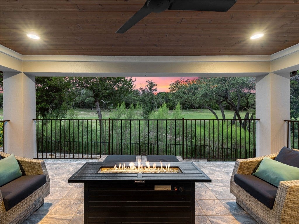 This spacious and tranquil hill country home is gracefully situated on the 16th hole on a quiet cul-de-sac in the lovely golf course community of Grand Mesa! Rare opportunity to own on this very unique street - the only street in this gated neighborhood to have access to both Grand Mesa and Travisso's world class amenities. Generous living space with soaring ceilings, a floor-to-ceiling stone fireplace, wall of windows that bring in tons of natural light and a thoughtful entertainment niche. Chef's kitchen with granite countertops, stainless steel appliances, an abundance of cabinet and counter space along with a cozy breakfast area. Luxurious primary suite with sitting area, granite counters, walk-in shower with separate bathtub and a huge walk-in closet. Fabulous, private backyard with a large covered patio and an inviting lounge area with firepit. Other features include a dedicated custom office, formal dining room, media room, extra living space with terrace access overlooking the golf course, rich hardwood floors downstairs, plush carpet upstairs and ample storage. Main-level secondary bedroom with private bath - perfect for multigenerational living. Easy access to 1431 through Travisso and a short drive to Randalls, Starbucks, Orangetheory, shops and restaurants. Come experience convenient hill country living at its finest!