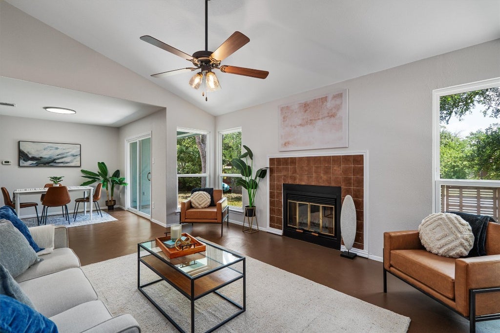 Step inside to find freshly stained concrete floors throughout, brand-new interior paint, updated doors and hardware, and a new ceiling fan in the living room. The space is filled with natural light thanks to recently replaced Energy Star dual-pane windows and large sliding glass doors that open to the yard—plus a classic wood-burning fireplace for cozy nights in.