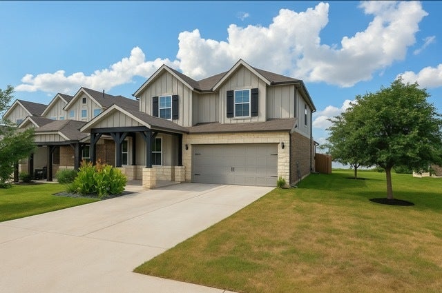 Beautiful Pulte home with natural stone, a covered front porch plus attractive landscaping create a warm welcome. At the front of the home, a professional office with elegant French doors offers a well-lit workspace, ideal for remote work or weekly planning. An open-concept layout connects the kitchen, dining area, and great room. A modern light fixture and ample windows bathe the space in natural light—perfect for family dinners or entertaining. The heart of the home features a large center island with seating for four, stunning granite countertops, and a professional-grade gas cooktop with stainless steel hood. Built-in double ovens, ample cabinetry, and a full pantry ensure both style and functionality. A second-floor loft with luxury vinyl flooring and ceiling fan offers endless possibilities—ideal as a playroom, media lounge, homeschooling area, or casual family hangout. With all 3 bedrooms upstairs is the laundry room conveniently located and a storage closet. Primary bedroom offers ample space and a spa-llike bathroom with separate shower/tub, double sinks, private toilet room and walk in closet. Enjoy added convenience with a built in desk off the kitchen & a tucked-away mudroom featuring built-in hooks, bench seating, and a storage closet as you enter from the garage—helping keep daily life organized and clutter-free. Step outside to your covered pergola and hot tub overlooking a picturesque pond. String lighting, extended covered deck space with pond views provide an ideal setting for evening relaxation and outdoor entertaining. Home offers sprinkler system, water softener and under the eave lighting for all your holidays festive lighting. Hot tub conveys with the home purchase. Make this property your next home!