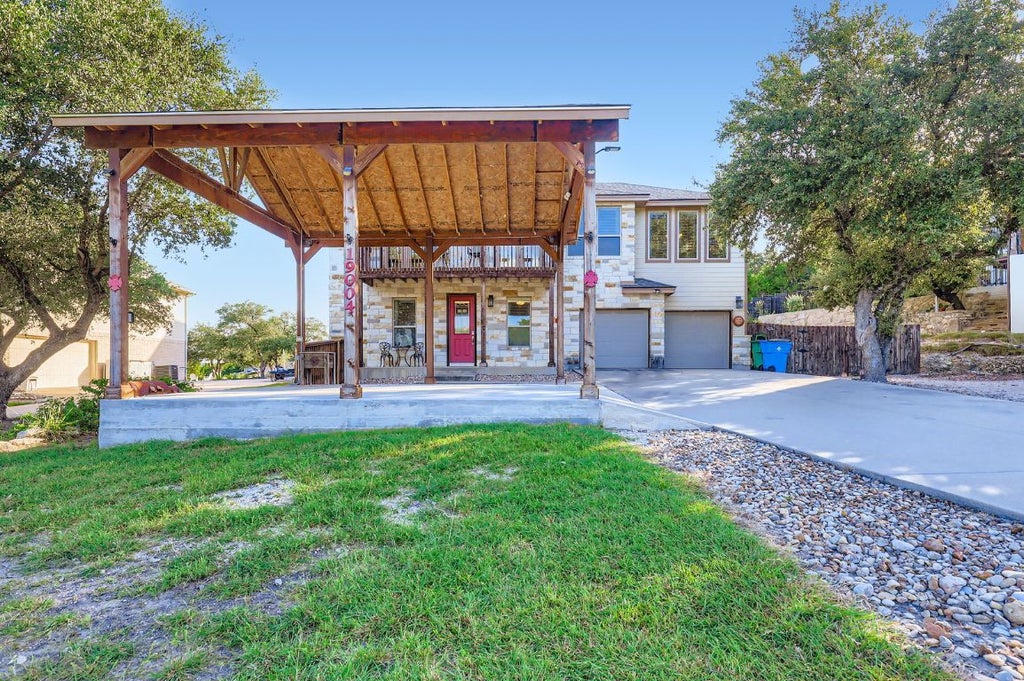 Live the lake life in this immaculate, bright and open Point Venture home. Over/Under floorplan puts the kitchen, living area and primary suite up where the views are while guests and family members can enjoy their own living area, 2 bedrooms and full bath downstairs. Lake life means lake toys and this home delivers with a large carport in front and larger open parking behind the privacy fence on the side yard in addition to the 2 car, attached garage. No toys? Then utilize the carport as a shady spot to relax and enjoy the Hill Country and lake breezes. The open floorplan upstairs takes advantage of elevation for plenty of sunlight and peekaboo lake views from multiple vantage points, including the second story deck off the kitchen and covered front porch directly accessible from the living area and primary suite. Easily entertain friends and family from the bright kitchen with large island and breakfast bar that flows right into a larger dining area. The living area is just as inviting and warm, complete with wood burning fireplace and stone hearth, wall of windows and access to the covered front porch. Escape to the primary suite with full bath including soaker tub and separate shower, large closet, and access to the front deck. Don't overlook all that Point Venture has to offer as well. This vibrant lakefront community is packed with parks, marina and yacht club, on the water dining, golf, tennis, pickleball and gym and a recently added market and grill and more. This house has been very lightly lived in, meticulously maintained and is ready to delight you at every turn!