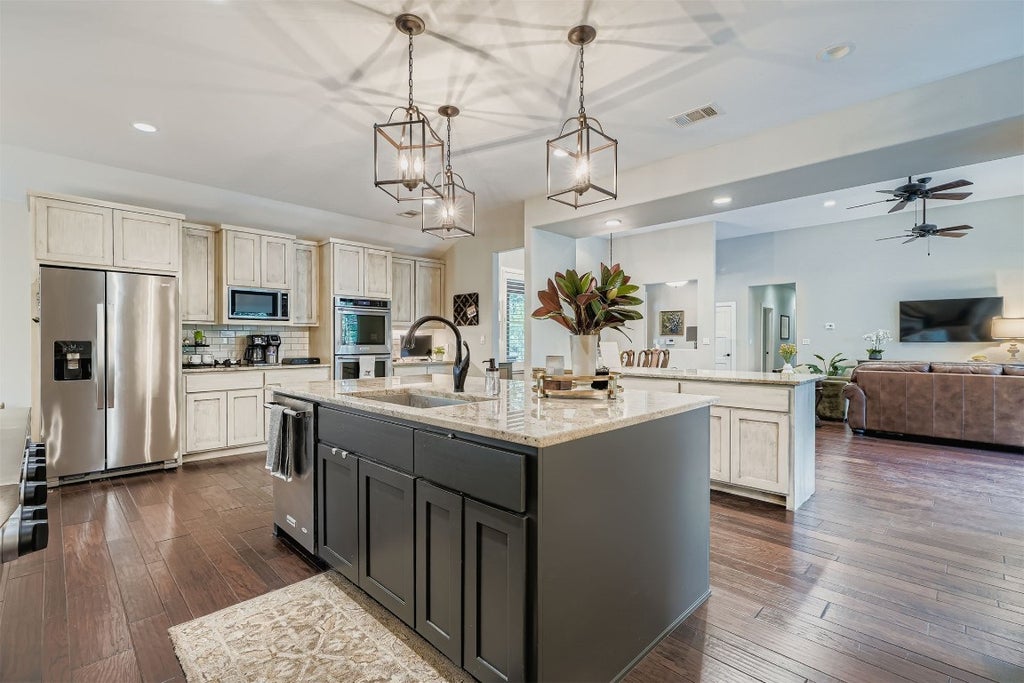 Appliances Built-In Oven, Double Oven, Dishwasher, Electric Water Heater, Microwave, Refrigerator, Water Softener Owned, Stainless Steel Appliance(s)