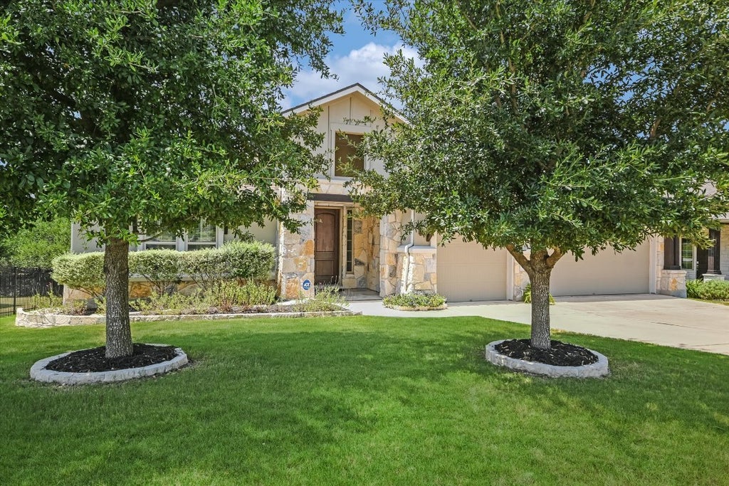 Beautiful, well-maintained 3 bedroom/3 bath plus study & 3-car garage set on lovely large lot and nestled in exclusive gated community of Abrantes in Cedar Park. Spacious open floorplan with gorgeous architectural details in this single story, East-facing home built in 2018. Private backyard with trees and "greenspace". Large covered front porch, covered patio in back, and unique courtyard on side give plenty of areas to enjoy the outside. Front porch opens to dramatic entry. French doors open to spacious study at entry. The open floor plan continues to formal dining area which is adjacent to patio doors opening to large courtyard area. The inviting living room with fireplace is open to the island kitchen and breakfast room. The large kitchen features beautiful granite countertops, tile backsplash, an abundance of painted cabinets, stainless steel appliances including double ovens, a walk-in pantry, and under cabinet lighting. The adjacent spacious breakfast room opens to the outdoor patio and second living area (multiuse--could be made into media room or used as playroom, etc.). The MIL layout features an inviting primary suite which includes an ensuite bath with dual vanities, an oversized walk-in shower, a garden tub, and two large walk-in closets. The secondary bedrooms are located on the opposite side of the home and include one bedroom w/ensuite bath and walk-in closet and another bedroom adjacent to bath w/large walk-in shower. The spacious laundry room with built-ins leads to a huge 3-car garage with floor w/polyaspartic finish. Wood-looking tile floors are throughout much of the home with tile included on porches and patio/courtyard. Many extras include alarm system, ceiling speakers, dust free air purification system, added insulation and flooring above garage, and more. Convenient location with easy access to major roadways and a variety of dining & shopping options. Near schools and wonderful parks!