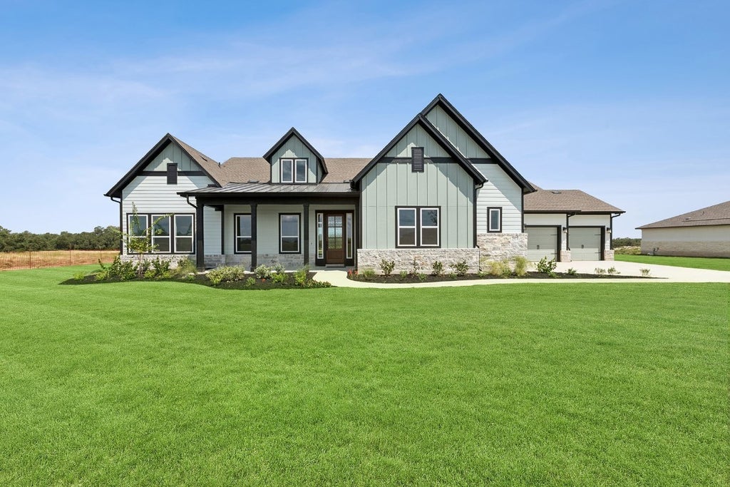 This new home is situated on an acre in Leander Estates and is Ready Now! Qualified for a $75,000 Pool Credit, inquire for more details with David Weekley Leander Estates Sales Team. Elevate your lifestyle with this stately new construction home in Leander Estates! Explore the remarkable lifestyle possibilities of the spacious and sophisticated Aldenridge floor plan, featuring a farmhouse styled exterior and located on a one-acre homesite. The modern black hardware and neutral gray tones throughout bring a modern, chic feel to the whole home. Begin and end each day in the private extended Owner’s Retreat, which includes a tray ceiling, modern en suite bathroom with Super Shower and a wardrobe-expanding walk-in closet. The guest suite and Jack-and-Jill bedrooms also offer privacy and unique appeal. Additionally, you can create your family’s ideal specialty rooms in the versatile front study and elegant sunroom. Host backyard cookouts and relax in the shade of your Outdoor Living Area, which you can access through your upgraded sliding glass doors. The streamlined kitchen is optimized for the resident chef with a contemporary arrangement of storage, prep surfaces and presentation space, complete with GE Cafe appliances and cabinets to the ceiling. Refined upgraded details include the 4-car garage and extended pantry. This home is sure to make a family of all sizes feel comfortable and settled, in no time. Call the David Weekley Homes at Leander Estates Team to begin your #LivingWeekley adventure with this new home in Leander, Texas. Our EnergySaver™ Homes offer peace of mind knowing your new home in Leander is minimizing your environmental footprint while saving energy. Square Footage is an estimate only; actual construction may vary.