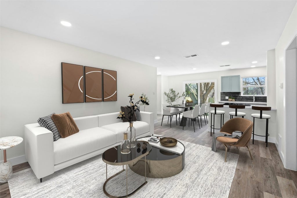 This stunningly remodeled home is in the heart of Austin’s desirable 78753 neighborhood. Offering modern design, thoughtful upgrades, and exceptional attention to detail, this home is perfect for those seeking style and comfort in a prime location. Step inside and be greeted by an open floor plan with a seamless flow from the kitchen to the living room. The kitchen features a sleek breakfast bar, durable TrueColor™ laminate cabinets, two large pantry cabinets for ample storage, and gorgeous Calacatta Forza quartz countertops. Stainless steel appliances, including a slide-in range, dishwasher, and vent hood, complete this contemporary culinary space. Conveniently, the laundry room is located inside the home, next to the kitchen, ensuring practicality meets style. The interior boasts newly painted walls, ceilings, trim, and doors, complemented by Dove Tail Oak Gray luxury vinyl flooring, which is waterproof, wear-resistant, and scratch-resistant. Bathrooms have been updated with elegant tile, modern vanities, a new tub, and chic plumbing fixtures, with a pocket door separating the full and half baths for added convenience. Energy efficiency is prioritized with newly installed blown-in attic insulation, Ply-Gem double-pane energy-efficient windows, and LED lighting throughout, saving you money while reducing your carbon footprint. The home is powered by a 2.5 Ton 14 SEER Bryant Air Conditioner Condenser, ensuring year-round comfort. The exterior features fresh paint, new siding, and a stylish new entry, garage, and sliding door. The backyard includes newly installed picket fencing, perfect for privacy and outdoor enjoyment. With every detail thoughtfully addressed, this fully remodeled home is move-in ready and truly one-of-a-kind. Don’t miss the opportunity to own a property that combines beauty, efficiency, and practicality.