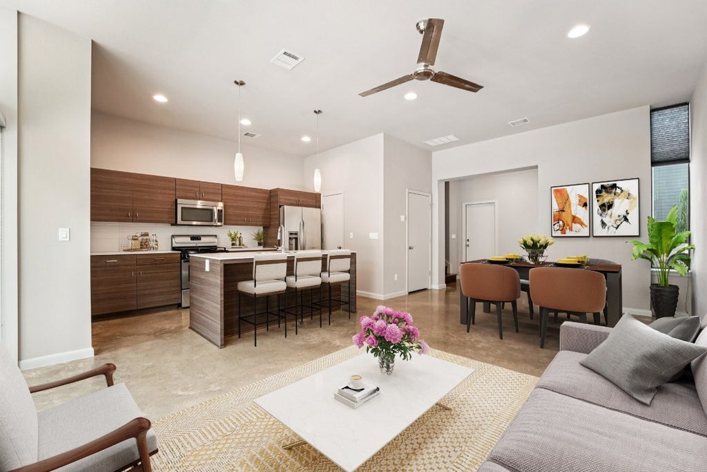 **PRIOR LISTING PRICE WAS AN ERROR - ACCURATE LIST PRICE IS $565,000**Come home to modern elegance at 404 Ashley Dawn Ln—an impeccably maintained 3-story condo nestled within a gated Sycamore community, just 2 miles from downtown Austin. This thoughtfully designed floor plan delivers exceptional flexibility with two primary bedroom suites on the middle level, and an additional versatile loft on the third floor, offering sweeping downtown views—ideal for an office, entertainment lounge, or guest retreat. Enjoy seamless indoor-outdoor living with a private backyard and patio that flow directly from an open gourmet kitchen, featuring quartz counters, island seating, and stylish finishes. Additional highlights include fresh interior paint, concrete floors, high ceilings, recessed lighting, a 1-car garage plus carport, an electric car charger and all appliances conveying—everything you need for move-in ready luxury. Walk to the city’s best shops, cafés, and restaurants from this serene yet walkable neighborhood setting. Experience comfort, style, and convenience—all in one exceptional package.