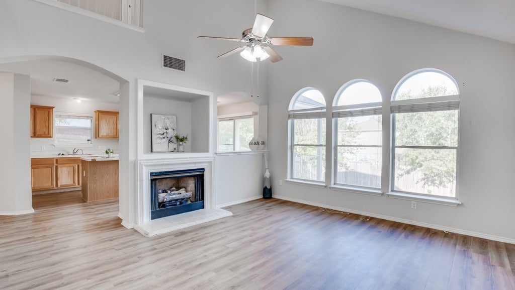 Welcome to 17414 Valentine Drive in the Round Rock community of Cambridge Heights, located in the Pflugerville School District. It offers a community pool, parks, playgrounds, and walking trails. Interior photos after Sept 30) Very nicely located between SH 45, W Pflugerville Parkway, and SW Grimes Blvd, this community, is well-established and known for its convenient location with La Frontera, Dell Computer, HEB, St. David’s Hospital, Baylor, Scott & White Medical, and more. Plus shopping, restaurants, and entertainment close in with easy access to SH 45 and IH 35. And Austin is just minutes away! Features Pre-Inspection. HVAC just replaced 2025. Roof replaced 2021, Flooring replaced 2022, This gorgeous two story home with stone and siding exterior, exudes curb appeal and longs to draw you inside! Private and Inviting covered patio, has wrought iron railing and looks out to the spacious treed back yard. Soaring vaulted ceiling shared natural light throughout the home. Stepping into the large living with beautiful arched windows, built-in shelving and the gas burning fireplace with artificial logs. You’ll find it conveniently open to the kitchen, with its island and breakfast bar. The dining area looks out over the patio and back yard. Attractive arched window and accents. 6 panel doors. Gas burning fireplace with artificial logs. Recent wood laminate flooring through the main floor and bathrooms.