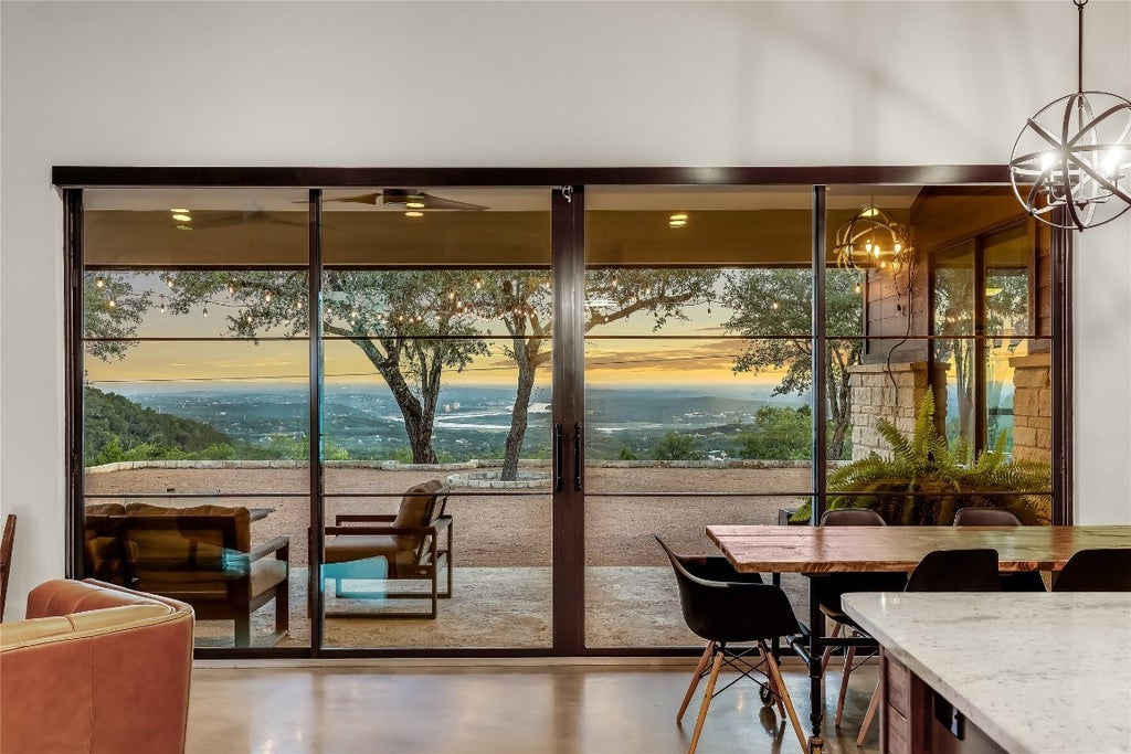 Perched high above the town below, this spectacular hill country flat double-lot retreat boasts panoramic views of the hill country and Lake Travis! The perfect blend of modern industrial design, built by award winning Silverton Custom homes, this home offers a sleek open floor plan. The main living area is enveloped by a wall of windows that flood the home with natural light and frame the sweeping views. Thoughtful custom design details shine throughout - floating vanities and soaking tub in the spa-like primary bath, custom built-in shelving, motorized shades, and integrated custom sound systems. In addition to the three bedrooms, an additional room offers ideal flexibility for a home office, guest bedroom or home gym. Submerge yourself in year round outdoor living with a beautifully landscaped backyard, enhanced with drip and sprinkle irrigation systems. Dine alfresco and savor your favorite grilled dishes in the exceptional covered outdoor kitchen! Beat the summer heat and cool off in the above ground Intex pool, or enjoy outdoor games in the oversized yard. For additional enjoyment, lounge on the massive covered front patio with friends or simply wind down from the day watching the sun set over the spectacular views. The oversized lot allows plenty of room to add an in ground pool. Additional features include a 10' x 12' shed, an extra covered parking area ideal for a boat, jet skis, trailer, vehicle or golf cart, and home is pre-plumbed for propane. Lago Vista is known for its rich array of amenities. Owning this property includes membership to the Lago Vista Property Owner's Association, allowing exclusive access to 9 private waterfront parks, basketball court, boat ramps, campground, disc golf course, fishing well, fitness center, hiking trail, marinas, parks, pavilions, pool, athletic field, tennis courts, pickle ball courts, playgrounds and more! This one-of-a-kind home seamlessly combines comfort, style, and function!