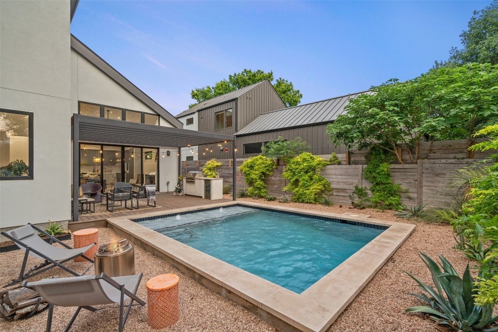 Tucked into the vibrant core of Austin’s Zilker neighborhood, 2010 Oxford Avenue is a modern luxury residence that effortlessly blends elevated design with walkable city living. Thoughtfully designed with flexibility in mind, the home features four bedrooms plus a dedicated office—easily adaptable to a fifth-bedroom layout. Expansive windows flood the interiors with natural light, highlighting clean lines, refined finishes, and marble countertops in the kitchen. A formal living room sets the stage for sophisticated entertaining, complemented by a striking wine wall and two wine refrigerators—one integrated indoors, the other in the outdoor kitchen for seamless alfresco hosting. Upstairs, a second living area provides a relaxed hangout zone, perfect for today’s modern lifestyles. The primary suite offers a private retreat with a luxurious soaking tub and oversized walk-in shower, while a second walk-in shower upstairs adds convenience and style. Over $100,000 in recent upgrades include the addition of a pool and meticulously landscaped backyard, transforming the outdoor space into a private resort-like escape. The temperature-controlled pool features programmable color-changing lights, and the outdoor kitchen and xeriscaped garden enhance the home’s low-maintenance, lock-and-leave appeal. A rooftop deck with sweeping downtown views adds yet another inspired living space. Moments from Zilker Park, Barton Springs, and South Lamar’s top restaurants and cafés—like Loro, Proud Mary, Opa, and more—this residence offers a rare opportunity to enjoy a European-style urban lifestyle within one of Austin’s most desirable neighborhoods. Located in the highly rated Zilker Elementary district.