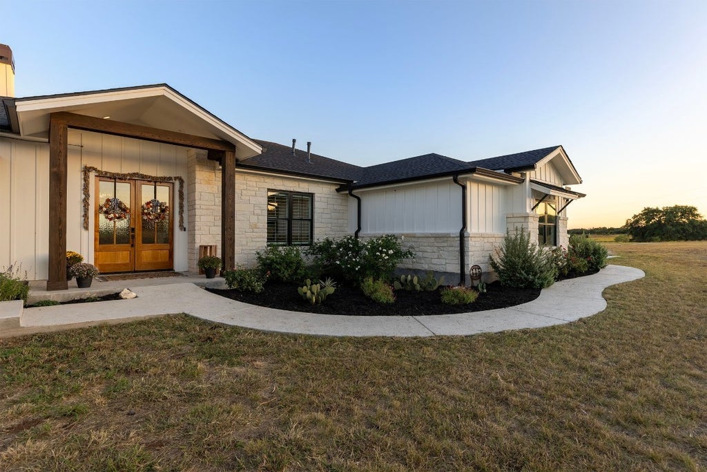 Nestled in the desirable 7 Creeks community, this 6-bedroom, 4.5-bathroom modern farmhouse offers the perfect blend of luxury and country living, sitting on 10 acres with breathtaking hill country views. The open-concept kitchen, living, and dining area features oversized sliding doors leading to a large covered patio, ideal for entertaining. The gourmet kitchen boasts KitchenAid Electrolux Architectural Series appliances, custom cabinetry, quartz countertops, and a spacious walk-in pantry. The living room is highlighted by a cozy fireplace and open shelving, creating a warm and inviting space for relaxing or displaying your favorite decor. Thoughtful design touches include a mudroom organization station, a laundry room with cabinetry, laundry sorting station, and a sink for added convenience. A dedicated office offers a quiet space for work, while the attached casita provides a private entrance, full bath, kitchenette, and laundry closet—perfect for guests or a home studio. The luxury primary suite includes a spa-like bath and an oversized walk-in closet. A beautifully designed Jack and Jill bath with double sinks connects two guest bedrooms. This home includes a propane-powered whole-house Gererac generator, well-house with a large capacity cistern tank and full gutters, a water softener, and a 3-car garage. The large covered patio features an outdoor kitchen, fireplace, and TV wiring, making it ideal for outdoor living and entertaining. The property is partially fenced and also has a separate dog run for pets and offers privacy with expansive views. The 7 Creeks community is a peaceful, wildlife-exempt neighborhood with reduced property taxes and easy access to local parks, shopping, and schools. For a modern farmhouse that combines luxury, comfort, and scenic hill country living, this home is a must-see. Schedule a private tour today!