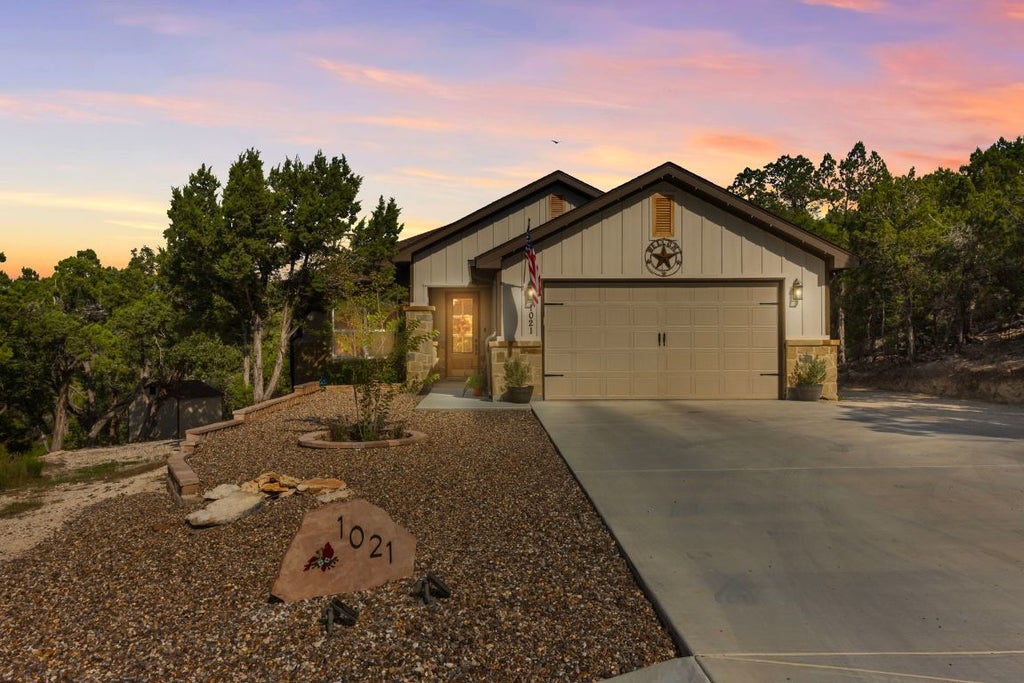 Welcome to 1021 Pinon Pass! Built brand new in 2023 and polished to perfection with major upgrades like lot leveling, enhanced landscaping, and stylish outdoor improvements, this like-new beauty shines inside and out. Sitting on over half an acre at the end of a quiet cul-de-sac, it offers privacy, peaceful surroundings, and those big-sky Hill Country views that never get old. Inside, the open layout impresses with high ceilings, abundant natural light, and sleek tile floors throughout—no carpet! The kitchen is a showstopper with quartz countertops, custom cabinetry, a spacious island, and a breakfast bar made for conversation and coffee refills. The living and dining areas flow effortlessly together, creating the perfect setting for hosting friends or winding down after a day near the lake. The primary suite is all about comfort and calm, featuring a generous walk-in closet and a spa-inspired bathroom with designer touches. Two additional bedrooms, a second full bath, and a dedicated laundry room complete the thoughtful floor plan. Added perks include a water softener, reverse osmosis system at the kitchen sink, radiant barrier attic decking, and a builder 10-year warranty for peace of mind. Out back, you’ll find plenty of room to live the Hill Country dream—host gatherings under the stars, plant a garden, or simply relax and soak up the view. The leveled yard and upgraded landscaping make it as functional as it is beautiful, while the RV access with 220v and 30amp hookup means adventure is always on the horizon. Located in the scenic Rancho Del Lago community near Canyon Lake and Wimberley, you’ll enjoy easy access to marinas, fishing, rivers, restaurants, and the charming small-town energy that makes this area so special. With its perfect blend of modern design, country ease, and thoughtful upgrades, 1021 Pinon Pass is more than a home—it’s your Hill Country haven. Schedule your private showing today!