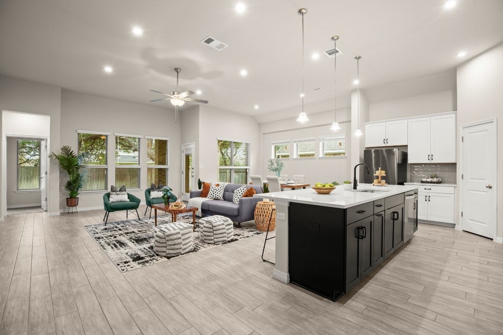 Located in the highly sought-after Carneros Ranch community, this stunning single-story home offers the perfect blend of modern elegance and everyday comfort, all while being just minutes away from shopping, dining, and top-rated Leander ISD schools. The charming brick exterior, complemented by lush landscaping and a welcoming covered entry, sets the tone for what’s inside. Step into the spacious open-concept interior where high ceilings, an abundance of natural light, and beautiful wood-look tile flooring throughout the main living areas create a warm, inviting atmosphere. The gourmet kitchen is a true centerpiece, featuring a large center island with breakfast bar, sleek quartz countertops, white shaker cabinetry, and stainless-steel appliances, including a gas cooktop. It effortlessly flows into a spacious dining area and a generously sized living room, both accented by recessed lighting—perfect for entertaining family and friends or enjoying quiet evenings at home. The private owner’s suite is a serene retreat, offering a large walk-in closet and a spa-inspired en-suite bathroom, complete with an expansive dual vanity and an oversized walk-in shower that promises relaxation and luxury. A guest suite with its own private bathroom ensures your visitors’ comfort, while two additional guest bedrooms and a flexible home office/flex room offer versatility for your lifestyle needs. Step outside to your fenced backyard oasis, featuring a covered patio ideal for outdoor dining, relaxation, or simply enjoying the serene surroundings. With its prime location in the desirable Carneros Ranch community, this home offers an exceptional lifestyle, combining quiet suburban living with easy access to local amenities and top-rated schools. Schedule a showing today!