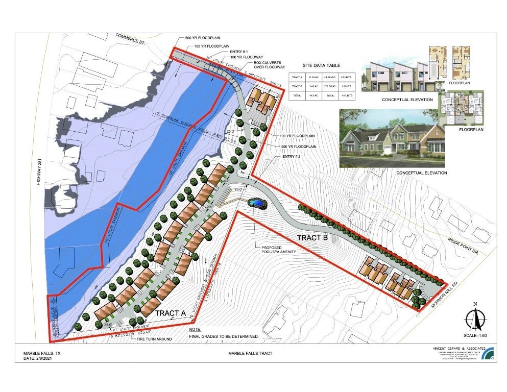 This prime development site offers outstanding visibility with frontage on US Hwy 281, Mormon Mill Rd, and Commerce Street, right in the heart of the Highland Lakes Region. Fully approved for townhome or condo development, it’s a great opportunity to bring a residential project to a thriving area. All utilities are available through the City of Marble Falls, making the development process smoother. A portion of the property does fall within the FEMA 100-year floodplain (see map for details), but there's still plenty of room to build. With its great location and full approvals already in place, this is an excellent spot for a new residential community in one of the most desirable areas of the region!