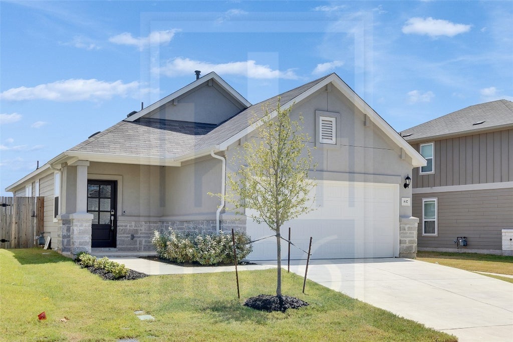Come see this brand new 3 bed 2 bath stunner in Buda! This property welcomes you with an open and naturally lit layout, kitchen, living and dining share a footprint, perfect to entertain, kitchen with all stainless steel appliances, island for added counter and storage space! Primary bedroom is complete with ensuite bath featuring double sink vanity, spacious walk in shower, storage and walk in shower! In the back you will find a covered porch and fenced yard for privacy. Enjoy the amenities the community offers: Pools, lazy river, pavilions, dog parks, playgrounds, greenbelts, picnic areas, walking and biking Trails! Located near Lake Bastrop and right outside of the city enjoy what nature has to offer or venture in for the local shopping, dining and entertainment the area has to offer!