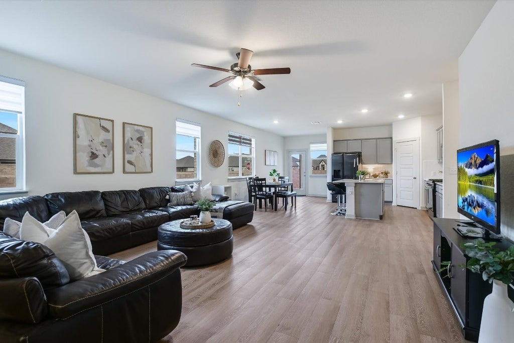 This two-story home boasts 4 bedrooms, 3 bathrooms, and an open-concept layout with a spacious family room and dining area seamlessly connected to a stylish kitchen. The kitchen showcases quartz countertops, a modern tile backsplash, and stainless steel appliances. The main suite serves as a tranquil retreat with a large walk-in shower and an expansive walk-in closet. Upstairs, you’ll find a versatile game room or second living space, along with the fourth bedroom and a full bathroom. Additional features include a professionally landscaped and irrigated yard. The Home Is Connected base package enhances convenience with Alexa Voice Control, a video doorbell, a front door deadbolt lock, a home hub, smart light switches, and a programmable thermostat. Ideally located off Highway 290 with easy access to 183, 130/45, and I-35, this impressive home offers a resort-style lifestyle adjacent to a golf course. Set on a premium corner homesite, it features 2,384 sq. ft. of well-designed living space.