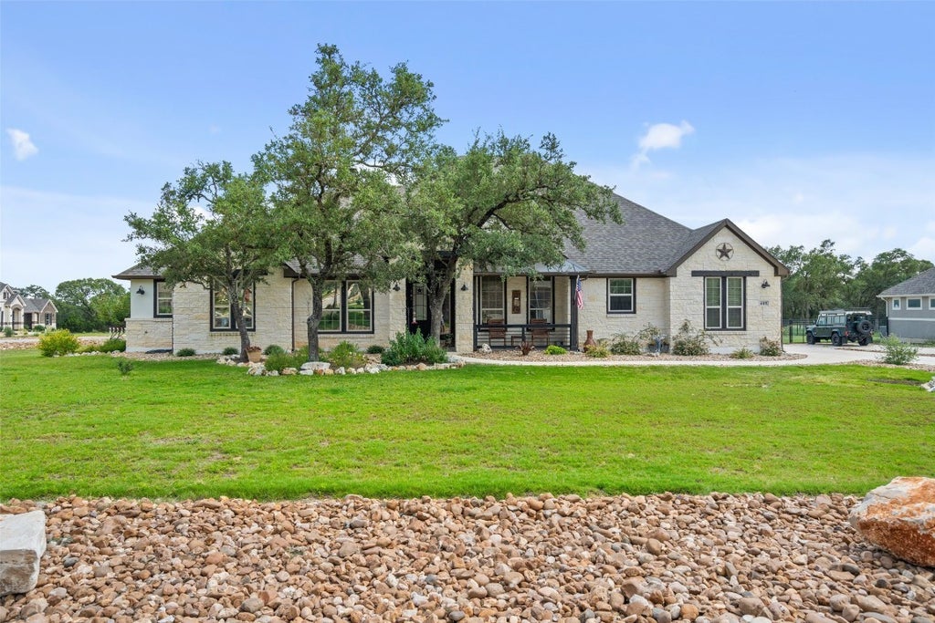 Well cared for home sits on one acre, corner lot with mature trees & offers unobstructed country views. Located in New Braunfels’ only 24 hour guarded & gated community. Built in 2022, the residence features an open floor plan, tall ceilings with 8 foot doors, wide plank white oak hardwood floors & beautiful stone floor to ceiling fireplace. This single story residence with 3 car garage includes 3 bedrooms, 2.5 bathrooms, study with French door entry, formal dining room with walk through to an expansive kitchen, breakfast nook & family room space. The kitchen design has an adaptable neutral color pallet- white shaker cabinets with crown moulding and quartz countertops compliment the travertine back splash. Note worthy kitchen elements include stainless steel appliances, induction heat stovetop, reverse osmosis water filtration, walk in pantry, large kitchen island with travertine kick plate and breakfast nook. Walk down the hallway off the kitchen to find a retreat that provides another option for a second home office/playroom. Double doors open to the supersized laundry room that accommodates an additional refrigerator and has ample cabinet storage with quartz countertops. Primary bedroom offers an expansive spa like en-suite with seamless glass shower enclosure, dual vanities, free standing tub and oversized master closet. Secondary bedrooms are joined by a Jack & Jill bathroom each with their own private vanity and sink. Home was completed with many upgrades- hardwood flooring, custom window treatments, light fixtures, poured concrete walk from driveway to back patio steps, tiled front & back patios, board and batten architectural accent walls in the formal dining & office, vertical shiplap accent in kitchen and hallway & water softener. Large back patio has both a sitting and grilling area with two steps down to the expansive flat backyard. Bring your backyard ideas as this property has endless options.