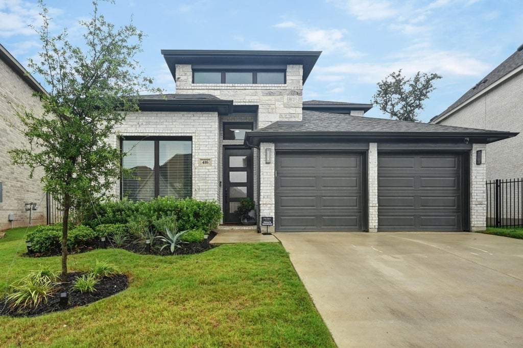 This 4 bedroom, 3 bathroom home in West Kyle’s 6 Creeks community is modern Hill Country living at its best, where clean lines, warm textures, and thoughtful design come together in all the right ways. From the moment you pull up, the standout curb appeal makes quite an impression with its mix of light brick and stone, bold black accents, and sleek rooflines that set the tone for what’s inside. Step through the front door and you're welcomed with high ceilings, warm wood floors, and black-framed windows that flood the space with natural light. The main level offers a dedicated office for working from home, plus an open living area that brings together the kitchen, living and dining spaces. A mix of Display and Clerestory windows bring in views of the greenbelt and back patio, creating an airy, gallery-like vibe. The kitchen delivers a sleek, modern look with bright white quartz countertops set against rich, dark cabinetry. Just off the living room, a covered back patio with wrought iron fencing offers a peaceful place to relax or entertain, overlooking a lush greenbelt with no back neighbors, giving you added privacy and a true sense of openness. Tucked at the back of the home, the primary suite is a quiet retreat with oversized windows that make the greenbelt views feel like living art. A generous walk-in closet and spa-inspired ensuite round it out. Also on this level is a guest bedroom near a full bath that’s ideal for overnight guests. Upstairs, the loft gives you flex space for a game room, den, or media space, plus two more bedrooms and another full bath. As a resident of 6 Creeks, you'll have access to a resort-style pool, pickleball courts, trails, a fishing pond, and more. Not to mention this home puts you a quick walk away from some of these amenities. Zoned to Hays CISD and perfectly positioned between Austin and San Marcos, 6 Creeks offers that laid-back South Austin feel with room to breathe and plenty to explore. Buyer to verify all info.