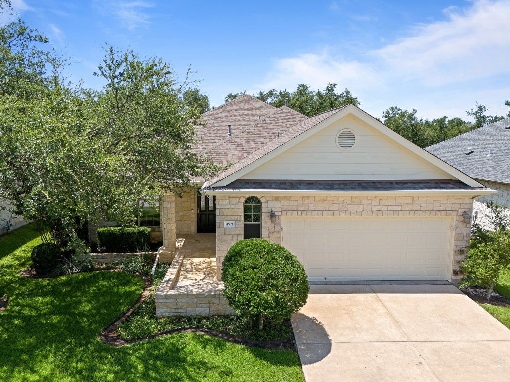 This home offers multiple living areas and seating arrangements! The living areas have streaming natural light. The entrance has a walk-up flagstone ramp. There are 3 bedrooms - one has laminate wood flooring and would make a great office or hobby room. The secondary bedrooms are just steps away from the guest bath. Master bedroom offers his and her closets! Also, beautiful view of the heavily treed back yard from a large window. Immaculate master bath with dual vanity counter, walk in shower and an oversized linen closet. The kitchen is open to the living areas with a generous breakfast bar. It has abundance of cabinets and counter space! Lots of DRAWERS - not just under cabinet storage. Garage has storage space on a side bump-out. Covered flagstone patio for outdoor enjoyment. Roof 2020. Come see why Heritage Oaks is Georgetown's premier active adult, over 55 community!