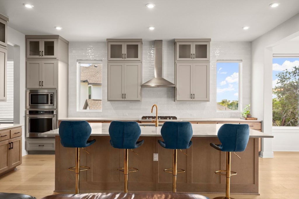 Built in 2022, this stunning home offers the perfect blend of modern luxury and Hill Country charm. Set on a quiet cul-de-sac and nestled on a heavily treed 1/2 acre lot, the property provides ultimate privacy and beautiful natural views. Inside, the thoughtful layout includes four spacious bedrooms, four and a half bathrooms, a dedicated home office, and a large game room—offering both functionality and comfort across 3,837 square feet (per TCAD). From the moment you step inside, you're greeted by high-end finishes including wide plank hardwood flooring, soaring ceilings, and modern horizontal stair railings. The heart of the home is the expansive great room, featuring oversized sliding glass doors and a stunning fireplace with tile extending to the ceiling. The kitchen is a dream for entertainers and chefs alike, with two-tone cabinetry, extended backsplash, added upper cabinets, and a custom vent hood that adds both style and sophistication. The luxurious primary suite offers a peaceful retreat with a freestanding soaking tub, a large walk-in shower, and dual vanities. Each secondary bedroom has access to its own full bath, making the home ideal for guests or a growing household. Outside, the private backyard is shaded by mature trees, creating a tranquil outdoor space perfect for relaxing or hosting. Additional highlights include a three-car garage, beautiful natural surroundings, and access to highly rated Lago Vista schools. This home is loaded with upgrades and showcases impeccable style throughout.
